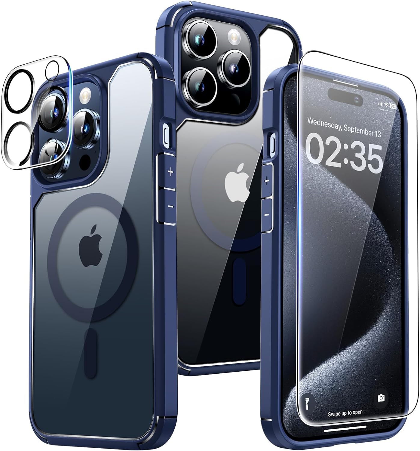 TAURI 5 in 1 Magnetic Case for iPhone 15 Pro Max [Military Grade Drop Protection] with 2X Screen Protector +2X Camera Lens Protector, Transparent Slim Fit Designed for Mag-Safe Case-Clear