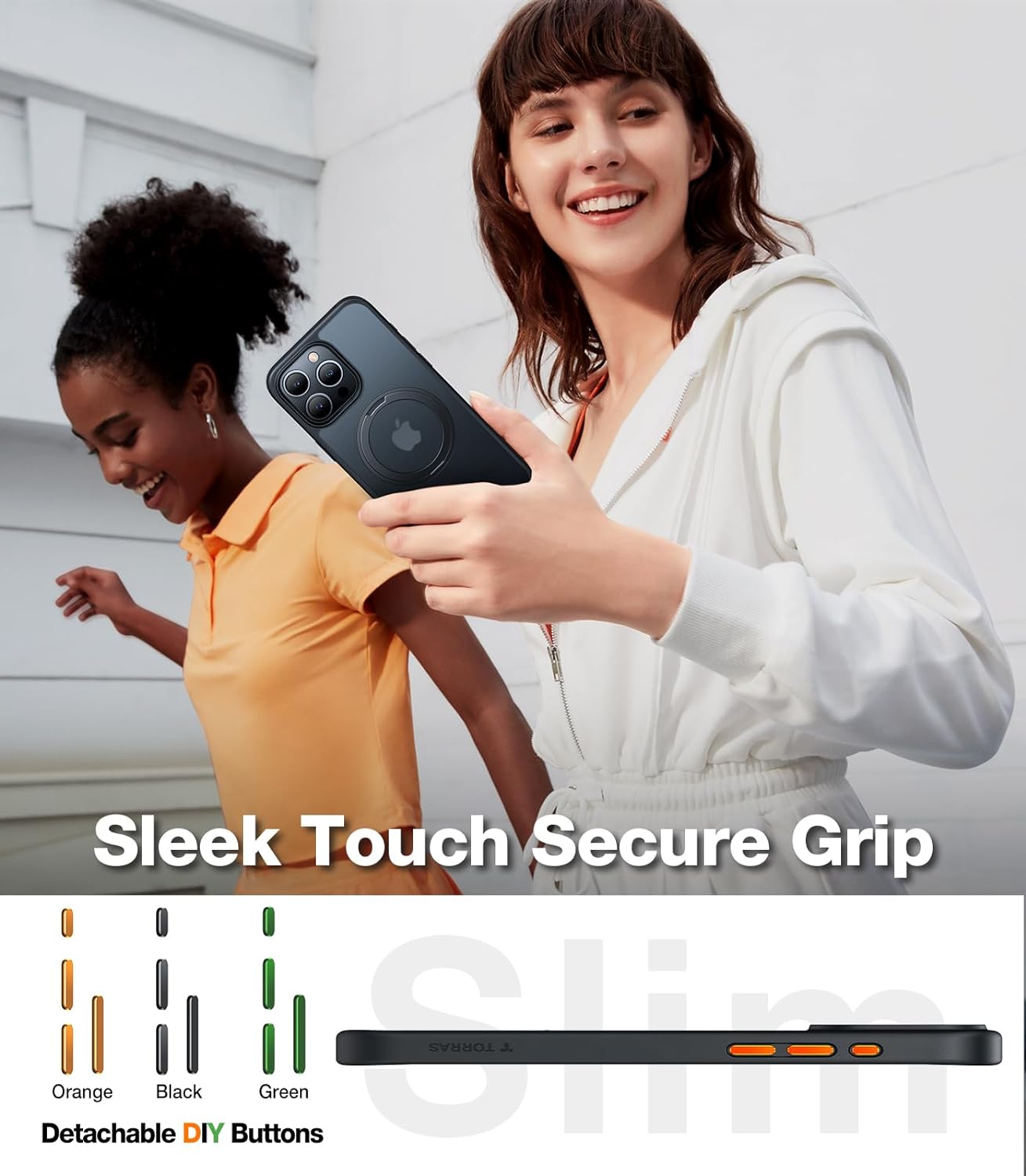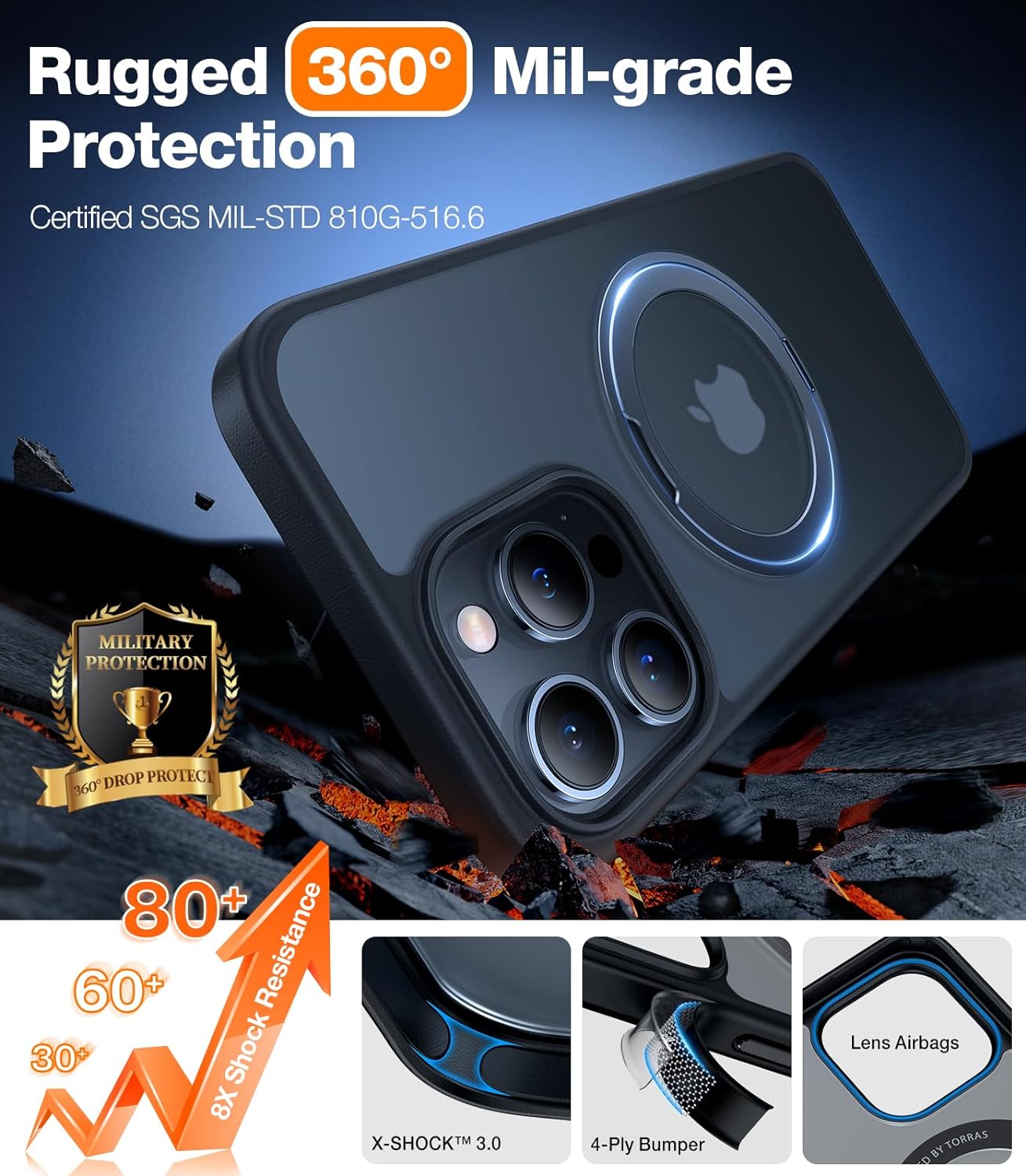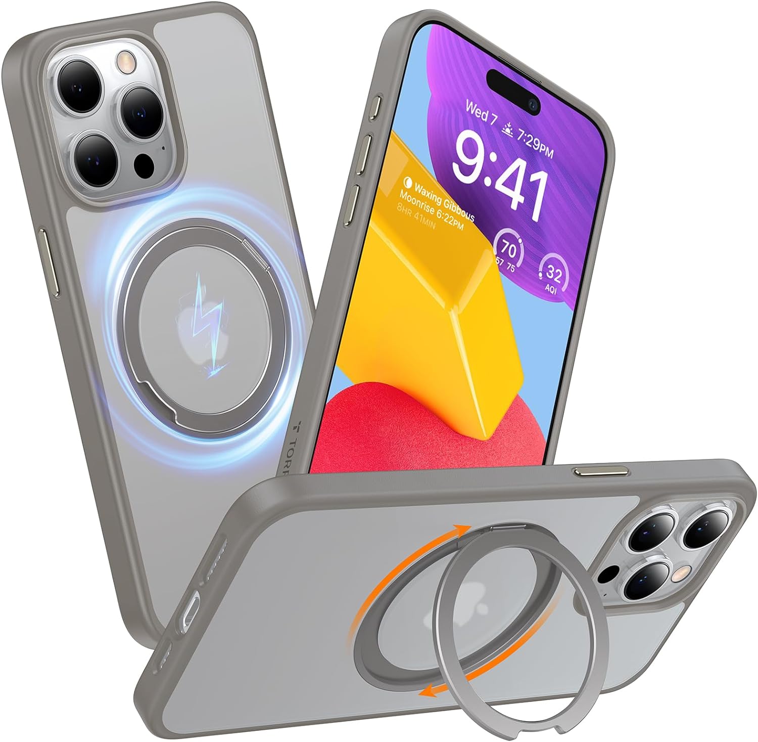 TORRAS 360°Rotatable Magnetic Ring Designed for iPhone 15 Pro Max Case, Compatible with MagSafe with Stand & Ring Holder, Military Grade Shockproof Translucent Back Phone Case Ostand R, Black