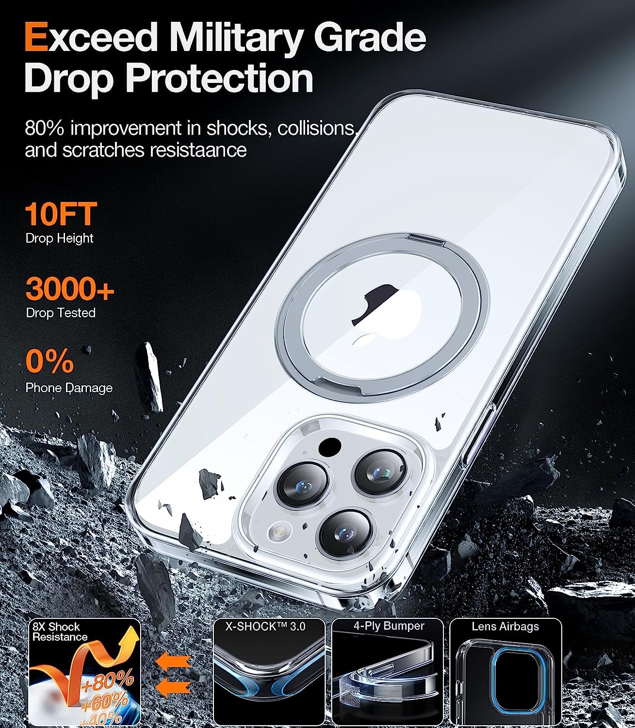 • ?[12FT Military Grade Protection] This shockproof 15 max pro case rigorously tested to withstand at least 10,000 drops from different heights up to 12 feet. High durability protection thanks to its 360°all-around air cushions and upgraded X-SHOCK minimizing impact on all corners. Raised 2.5 mm camera lip and 1.5mm screen bezel for added protection. Military grade protection certified to the MIL-STD-810H standard to be able to protect your phone from the daily grind