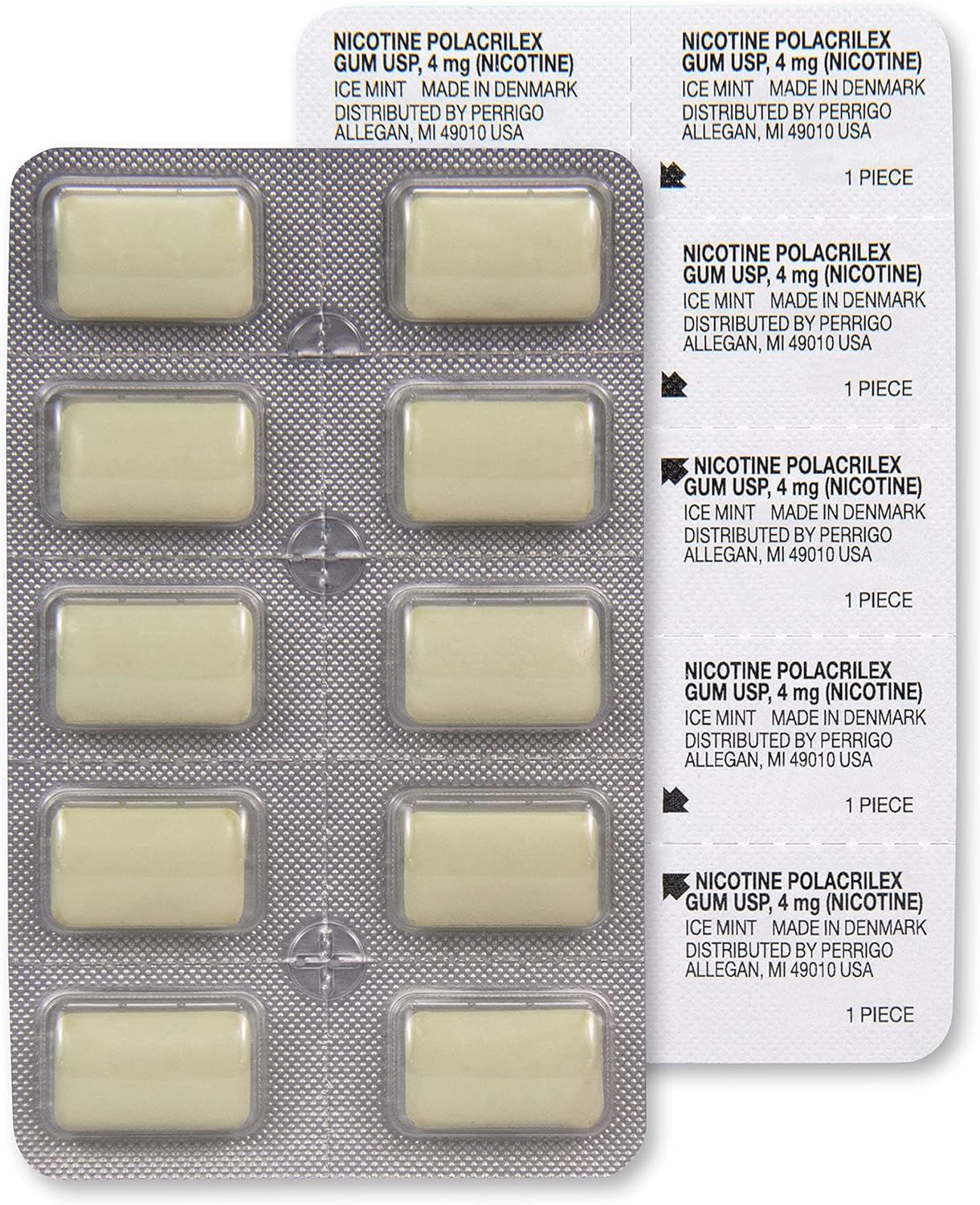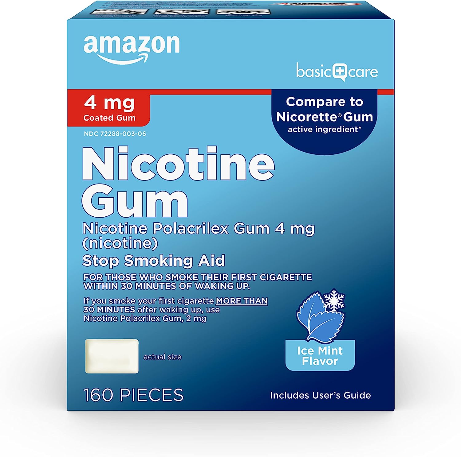 Compare to Nicorette Gum active ingredient. Double your chance to successfully quit smoking with Amazon Basic Care Nicotine Polacrilex Coated Gum, 4 mg (when used as directed with a support program. Many people require several quit attempts to stop smoking). Amazon Basic Care Nicotine Polacrilex Coated Gum, 4 mg (nicotine), Ice Mint Flavor, is a stop smoking aid for those who smoke their first cigarette within 30 minutes of waking up. This product is part of a Nicotine Replacement Therapy, which is designed to wean your body off cigarettes. It helps to regulate, control and gradually reduce your body's nicotine cravings. Smoking has two addictive components, a physical and a mental need for the nicotine in tobacco. Nicotine gum addresses the physical need to smoke by reducing withdrawal symptoms, including nicotine cravings.