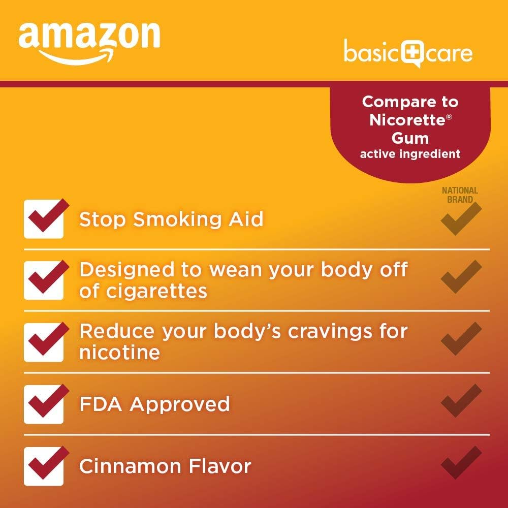 Compare to Nicorette Gum active ingredient. Double your chance to successfully quit smoking* with Amazon Basic Care Nicotine Polacrilex Coated Gum, 4 mg (nicotine). Amazon Basic Care Nicotine Polacrilex Coated Gum, 4 mg (nicotine), Cinnamon Flavor, is a stop smoking aid for those who smoke their first cigarette within 30 minutes of waking up. This product is part of a Nicotine Replacement Therapy (NRT), designed to wean your body off cigarettes. It helps regulate, control and gradually reduce your body's nicotine cravings. *When used as directed with a support program. Many people require several quit attempts to stop smoking.