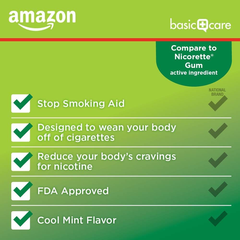 Compare to Nicorette Gum active ingredient. Double your chance to successfully quit smoking with Amazon Basic Care Nicotine Polacrilex Coated Gum, 4 mg (when used as directed with a support program. Many people require several quit attempts to stop smoking). Amazon Basic Care Nicotine Polacrilex Coated Gum, 4 mg (nicotine), Mint Flavor, is a stop smoking aid for those who smoke their first cigarette within 30 minutes of waking up. This product is part of a Nicotine Replacement Therapy (NRT), designed to wean your body off cigarettes. It helps regulate, control and gradually reduce your body's nicotine cravings.