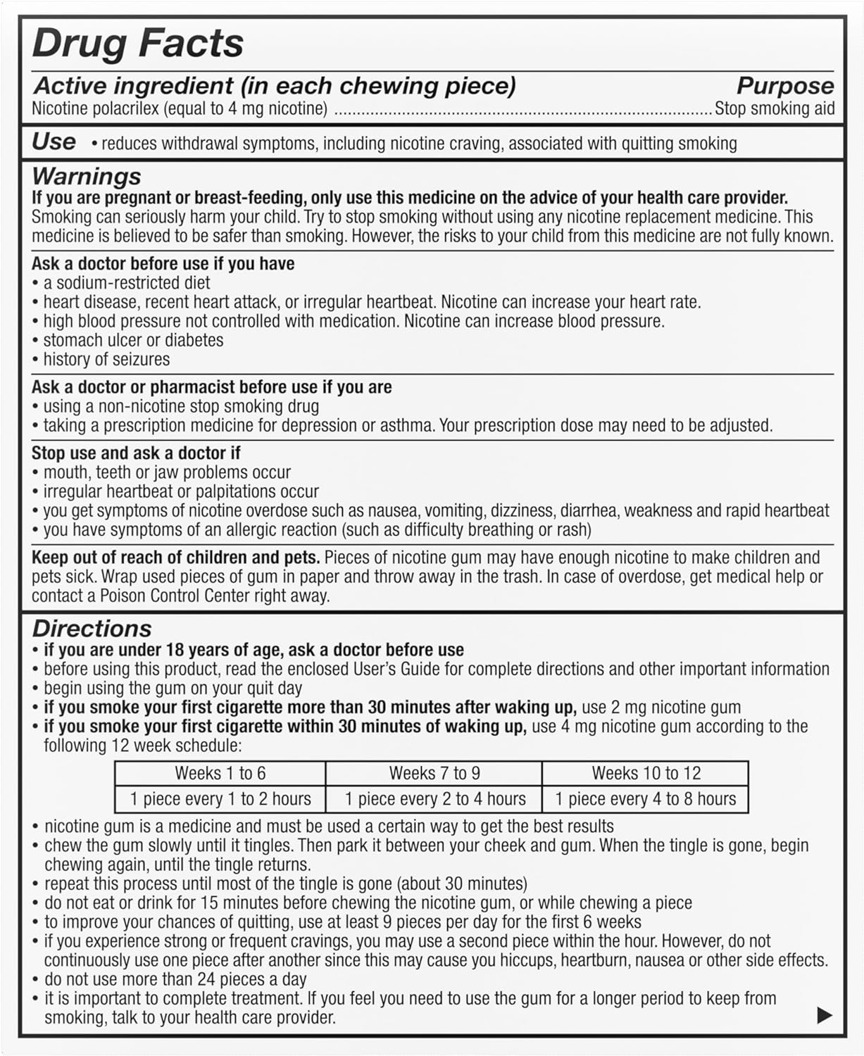 This gum offers withdrawal relief associated with smoking cessation. It is specially formulated with nicotine to help reduce withdrawal symptoms as well as cravings and can help you quit your smoking habit. The gum is aids in smoking cessation. Start with nine pieces of gum, then reduce your count each day until symtpoms and cravings stop.