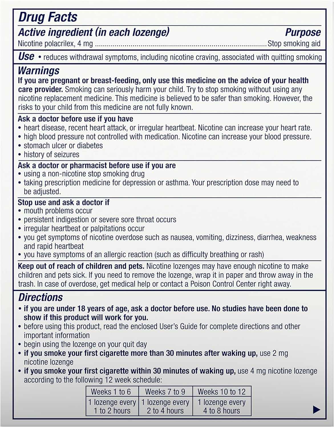 This lozenge offers nicotine withdrawal craving relief associated with smoking cessation. It is specially formulated with nicotine to help reduce withdrawal symptoms and can help you quit your smoking habit. The lozenges aid in smoking cessation. Use them in the morning to prevent cravings and symptoms in your day-to-day.