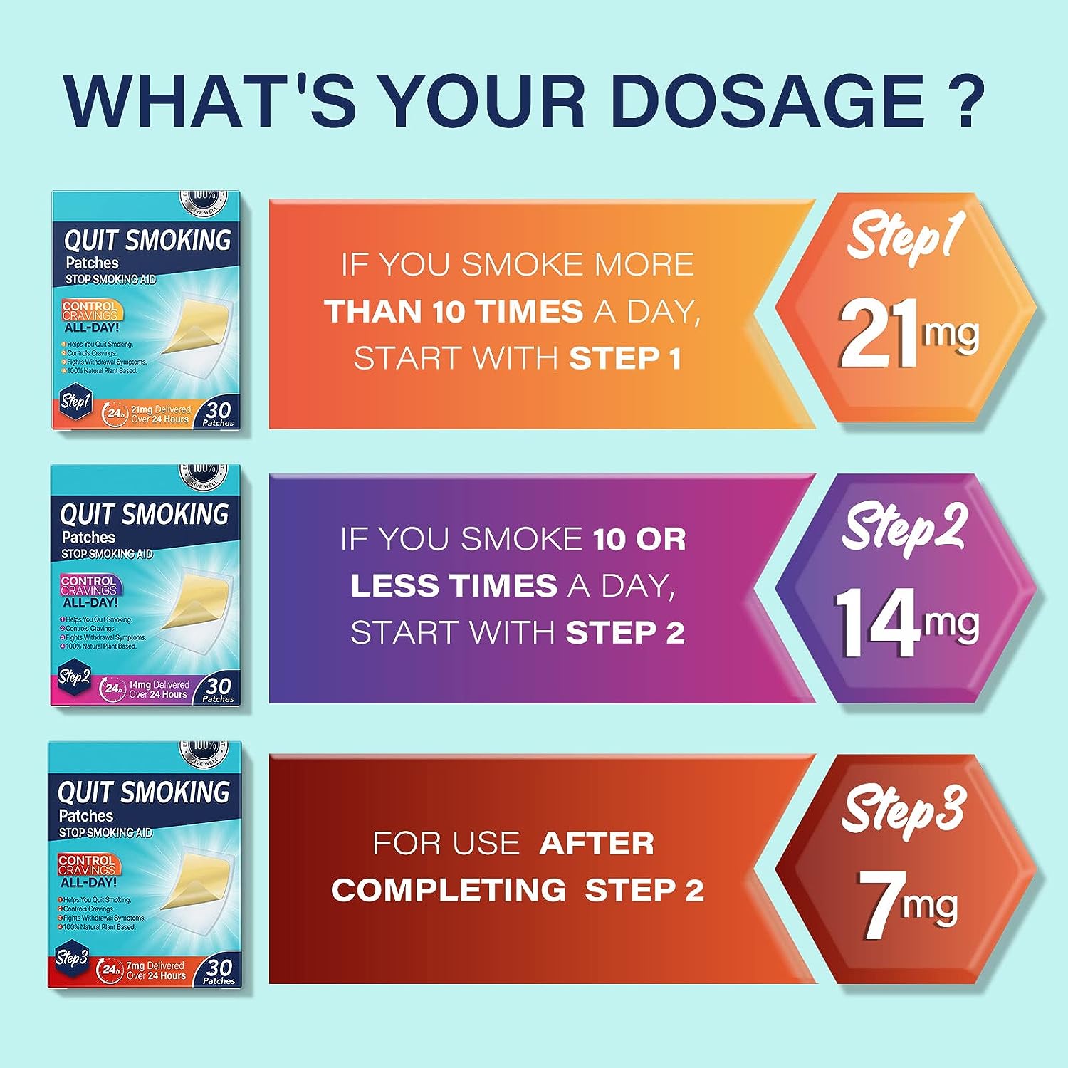 • 【BEST USE PROGRAM】Smoking Aid to Quit Smoking provides 3-Step method to stop smoking in 8-10 weeks. If you smoke more than 10 cigarettes a day, please choose to start with the 21 mg patch (step 1).
