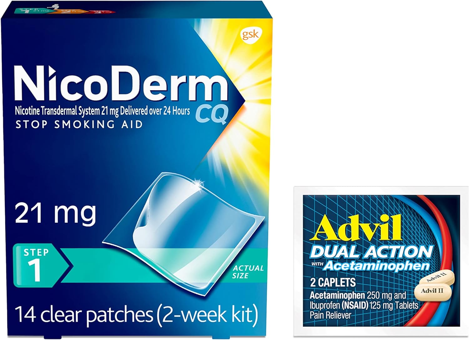 Step 1 NicoDerm CQ Nicotine Patches to Stop Smoking help you adjust to life as a non-smoker. Made with Extended Release SmartControl Technology, these smoking cessation patches are nicotine replacement products that release a steady flow of therapeutic nicotine for 16 to 24 hours, preventing the urge to smoke and relieving the anxiety, frustration, irritability and restlessness associated with quitting. If you smoke more than 10 cigarettes a day, start with these 21 mg nicotine patches as your OTC nicotine replacement therapy, and complete the 10-week quit program. Advil Dual Action Coated Caplets with Acetaminophen is the first FDA approved pain relief medication that combines the top two selling OTC pain-fighting ingredients for powerful results. Formulated with 250 mg Advil that targets pain at the source and 500 mg acetaminophen that blocks pain signals in each dose (one dose is 2 caplets), these coated pain relief pills provide relief from aches and pains, such as headaches.