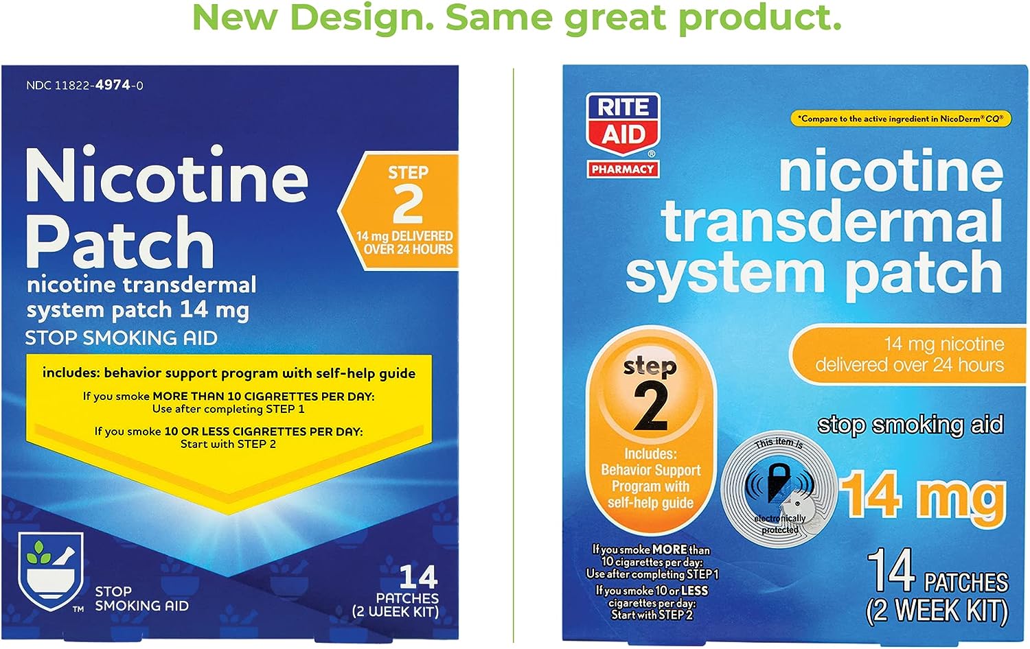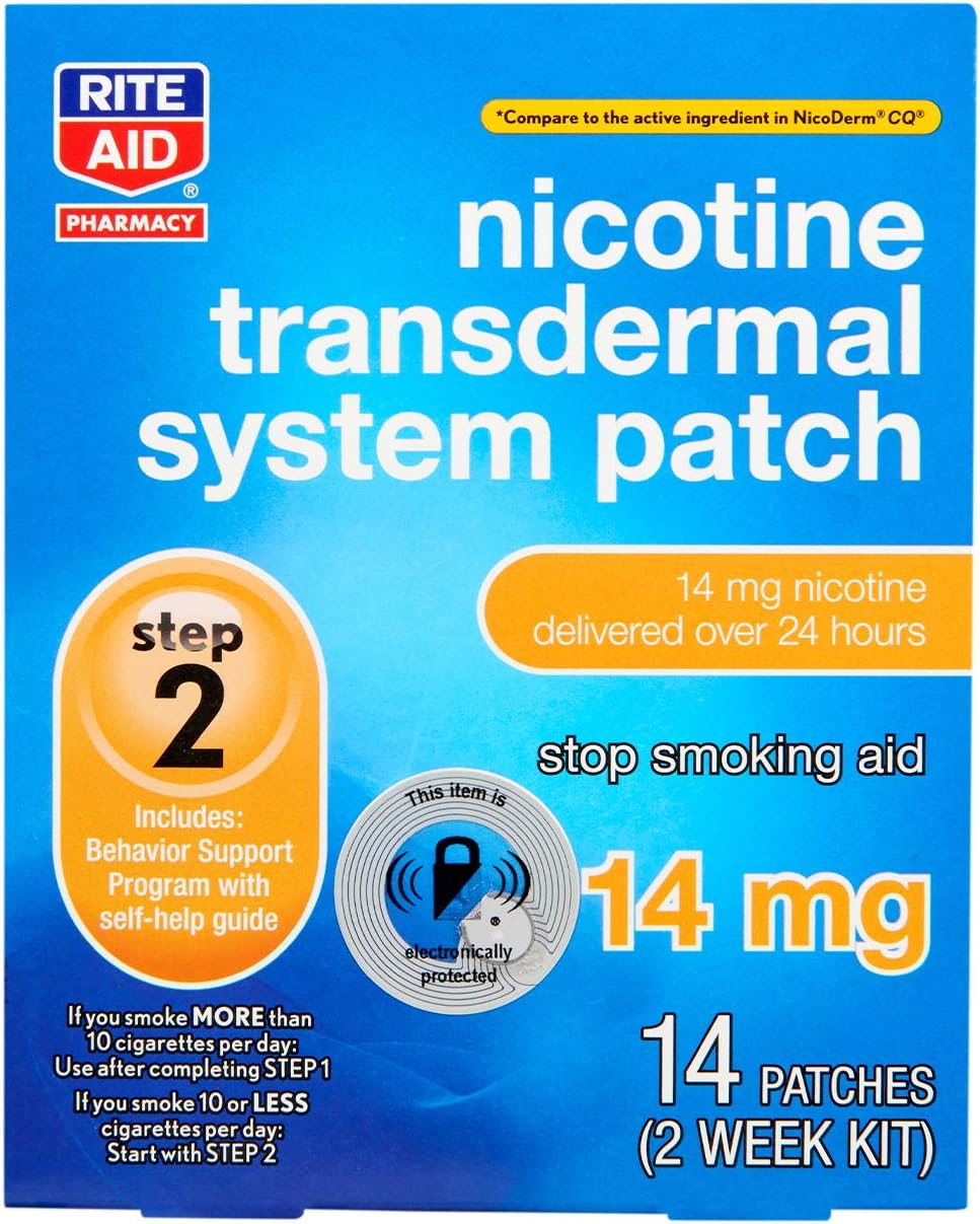 • 14 MG NICOTINE REDUCES CRAVINGS: Rite Aid Nicotine Transdermal System Patches, Step 2, have 14 mg Nicotine to help reduce your cigarette cravings. Compare Rite Aid to the active ingredient in top national brands, and quit smoking at a fraction of the cost.