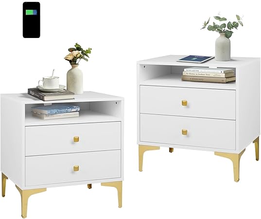AILEEKISS Nightstands Set of 2 with Wireless Charging Function Wooden Night Stands 2 Sets with Drawers and Open Shelf Storage End Table Home Bedside Table for Bedroom (White 2 Sets)