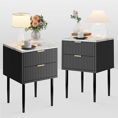 Anbuy Black Marble Nightstands Set of 2 with Gold Handle, Striped Night Stand with Drawers, End Side Table with Faux Marble Top, 2 Drawers End Table Metal Legs for Bedroom, Living Room