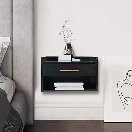 Floating Nightstand with Drawer, Black Wood Finish, Modern Night Stand with Gold Hardware, Enclosed Drawer and Open Shelf, Easy Assembly & Install, Strong Bamboo with Top Shelf Edge Guard
