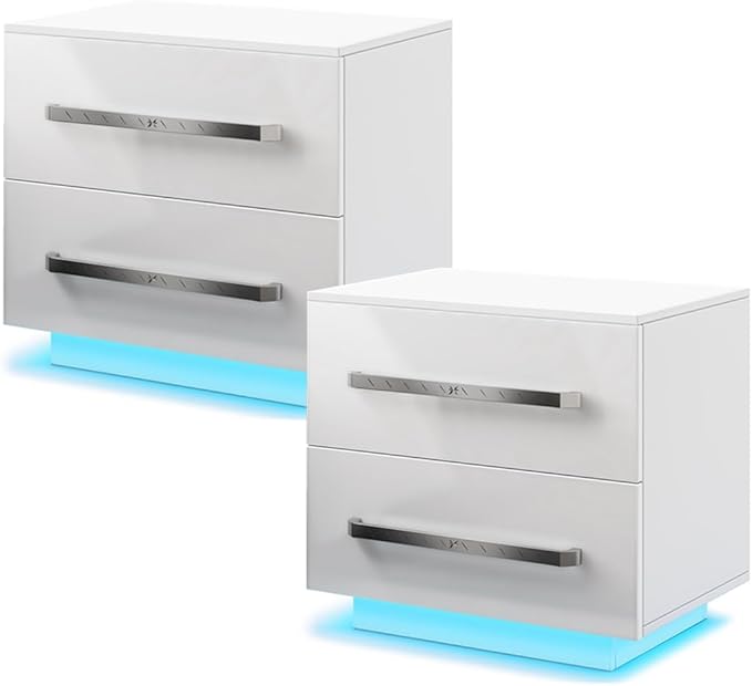 HOMMPA Small LED Nightstand Set of 2 White Nightstand with LED Light Modern Matte LED Bedside Table Night Stand with High Gloss Drawers for Bedroom Nightstand Furniture Set 19.7" Tall