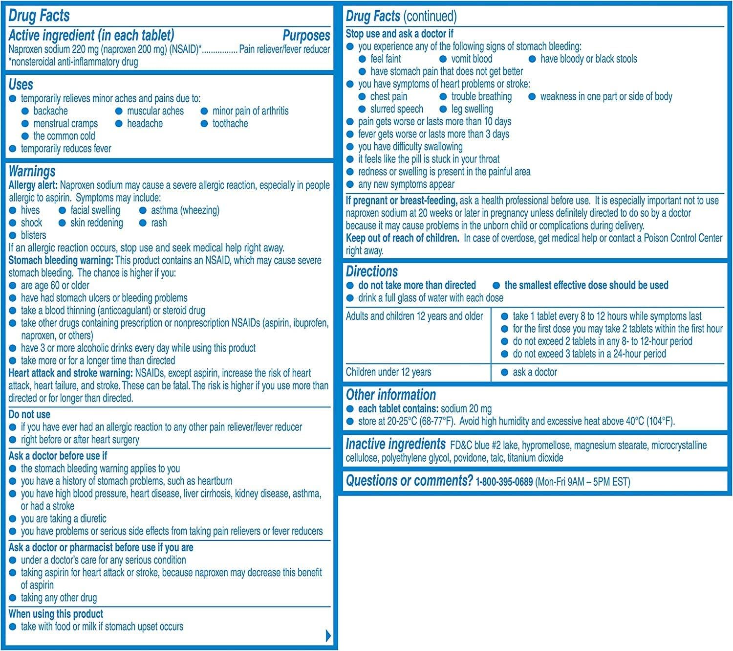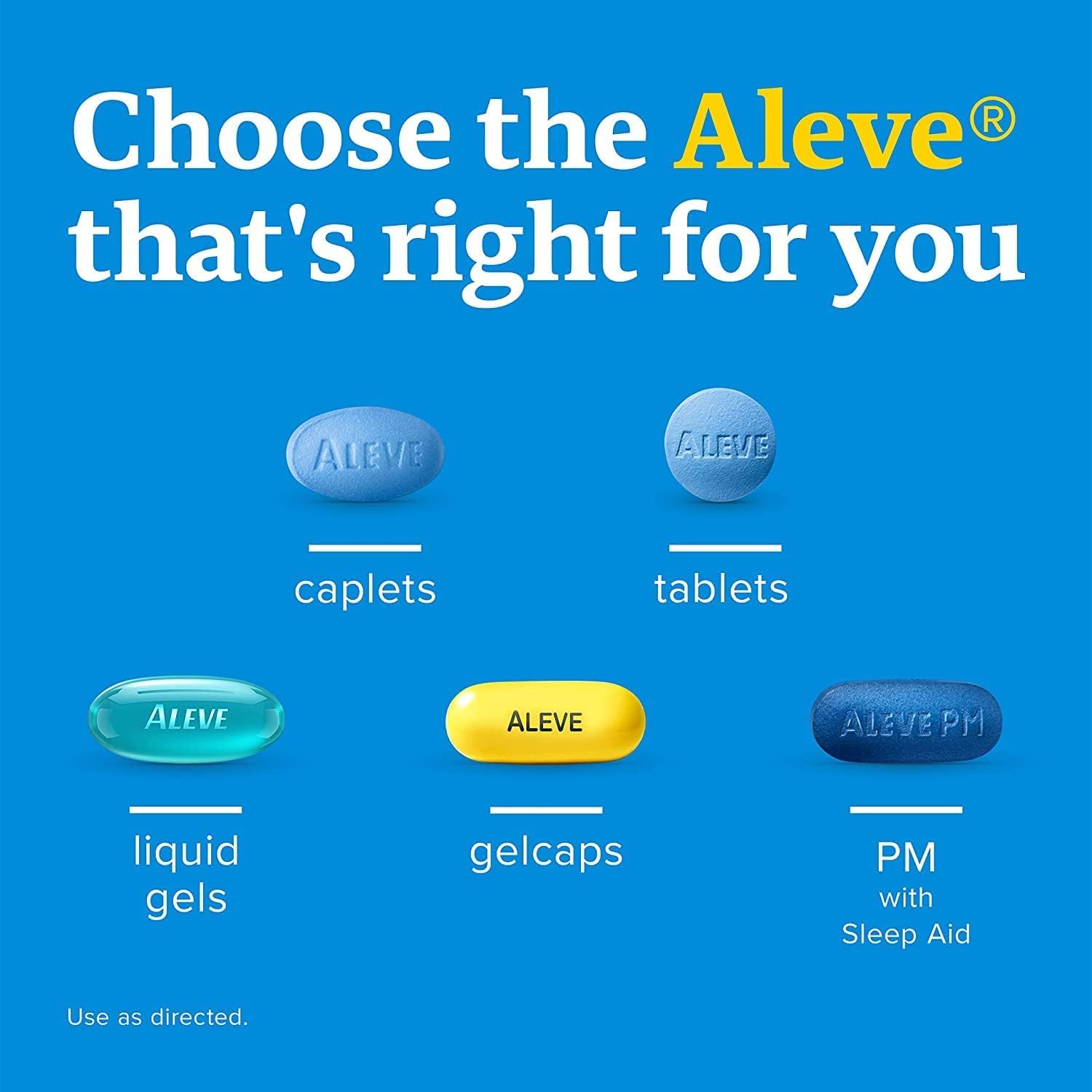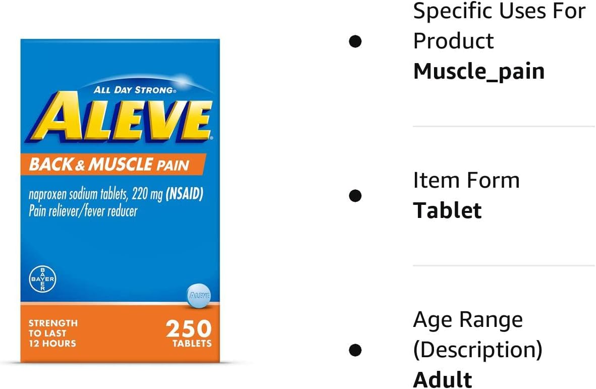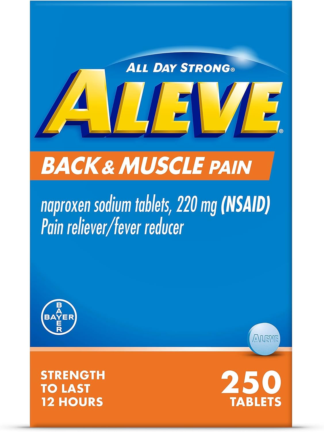 Aleve Back and muscle pain relief Naproxen Sodium tablets provide targeted muscle and back pain Relief. Each Naproxen Sodium 220 mg Tablet has the strength to deliver up to 12 hours of effective back and muscle pain relief. Aleve is formulated to manage minor pain from a backache and other minor muscle aches and pains. Available in small, round tablet form, these back and muscle pain relief pills are easy to swallow and come in a convenient child‐resistant bottle. Pain happens. Aleve It.