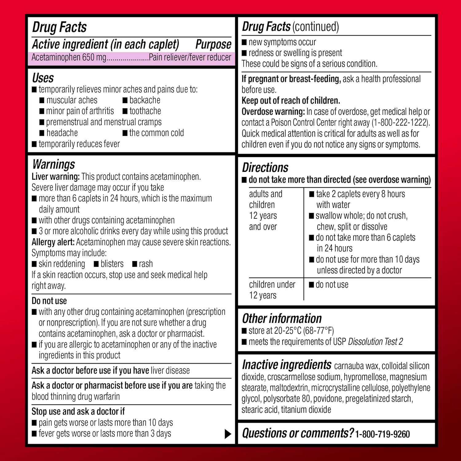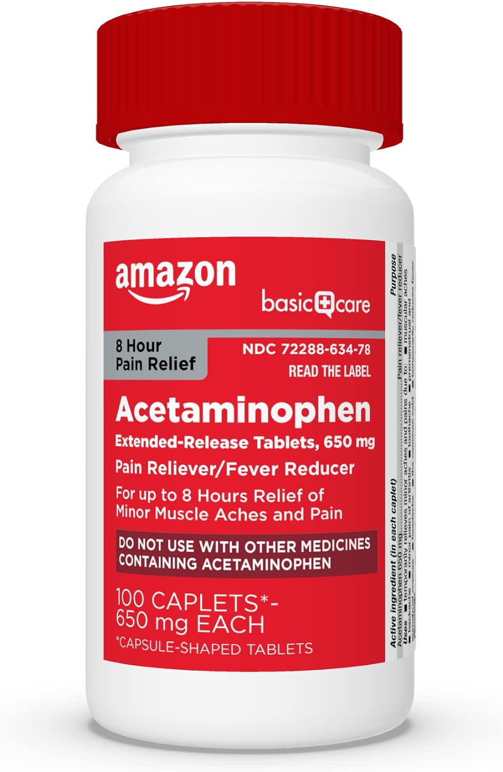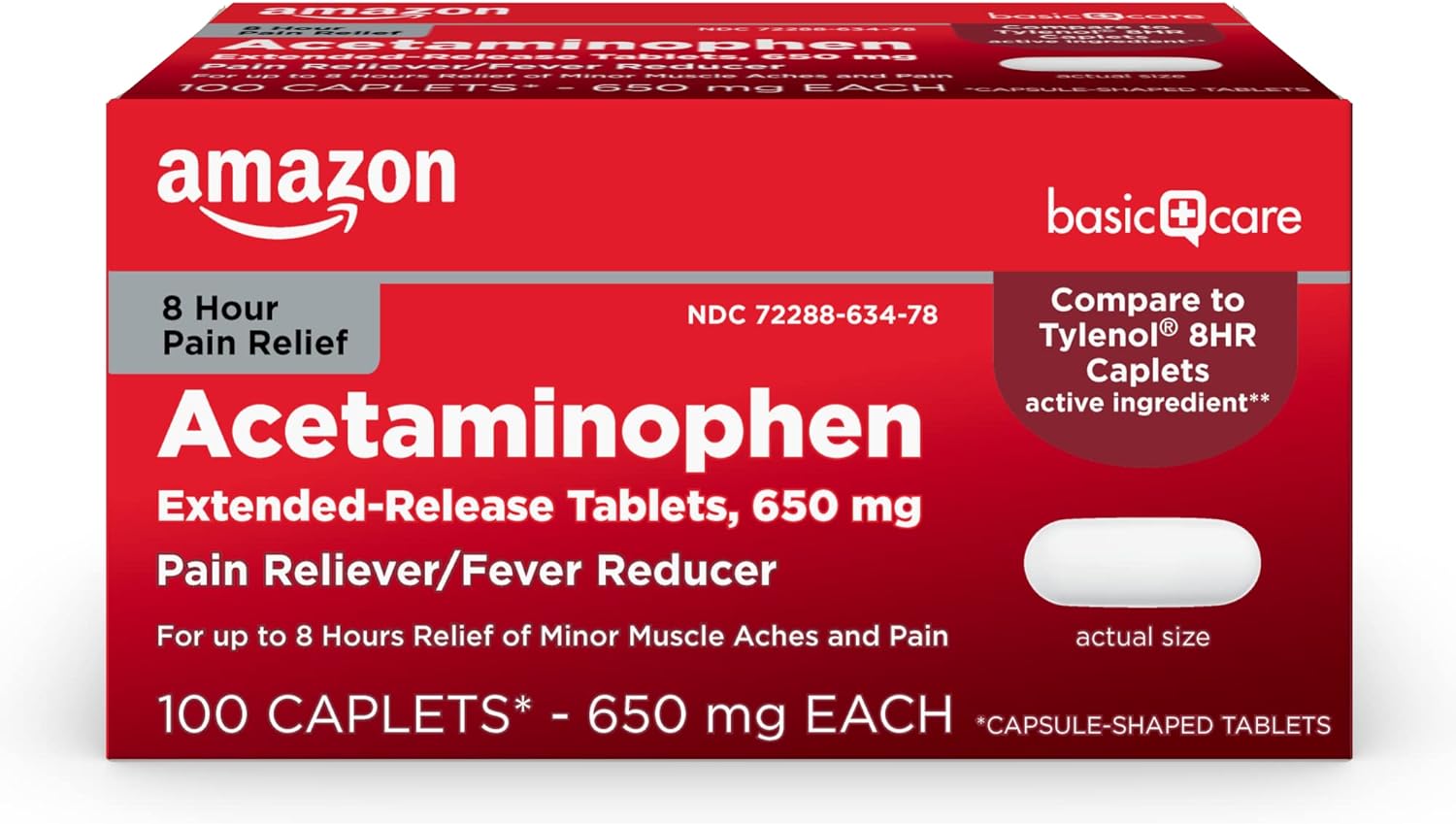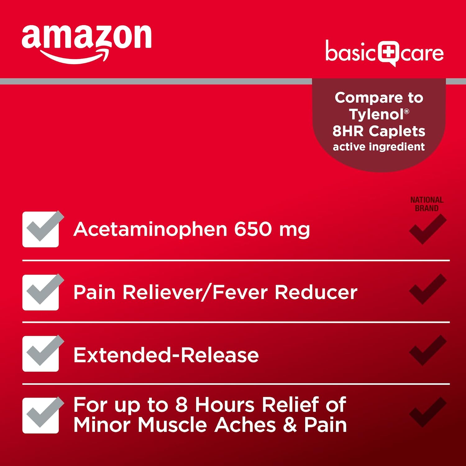 Compare to the active ingredient of Tylenol 8HR. Find relief from aches, pains and fever with a pain reliever/fever reducer that provides effective relief to help you get through the day. Amazon Basic Care Acetaminophen Extended-Release Tablets 650 mg provides up to 8 hours of relief for minor muscle aches and pains, backache, minor arthritis pain, toothache, premenstrual and menstrual cramps, headache and the common cold. It also helps to temporarily reduce fever. The active ingredient in this pain reliever/fever reducer is acetaminophen 650 mg. Contains no aspirin and is gluten free. For adults and children 12 years and older. Features a push and turn cap that is child-resistant.