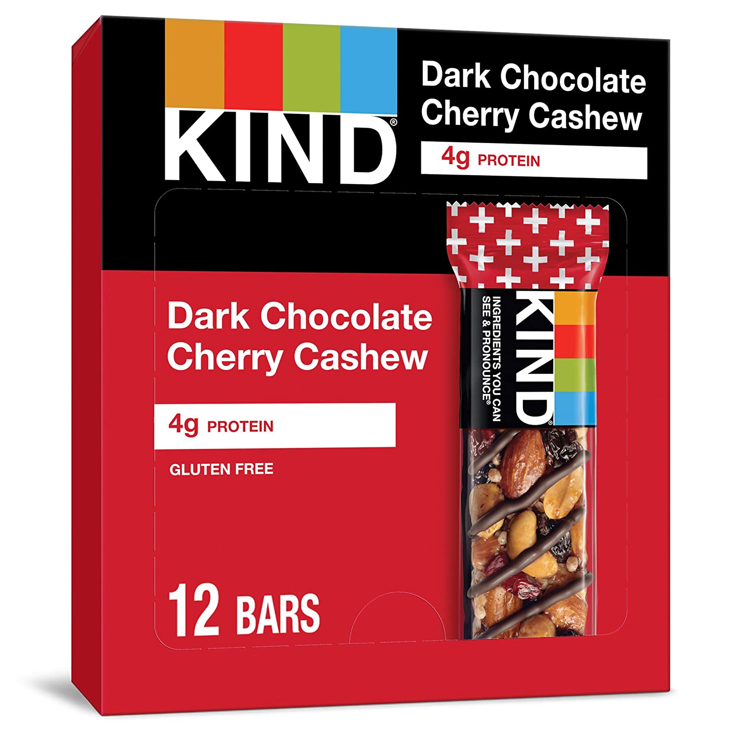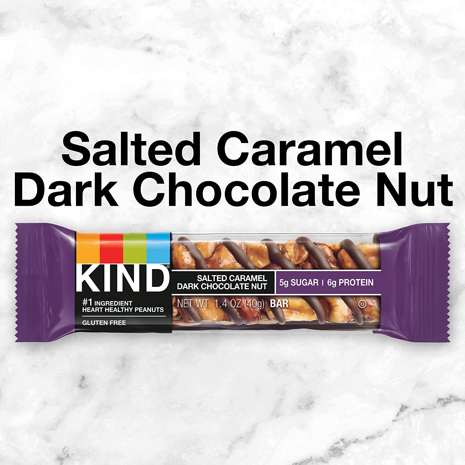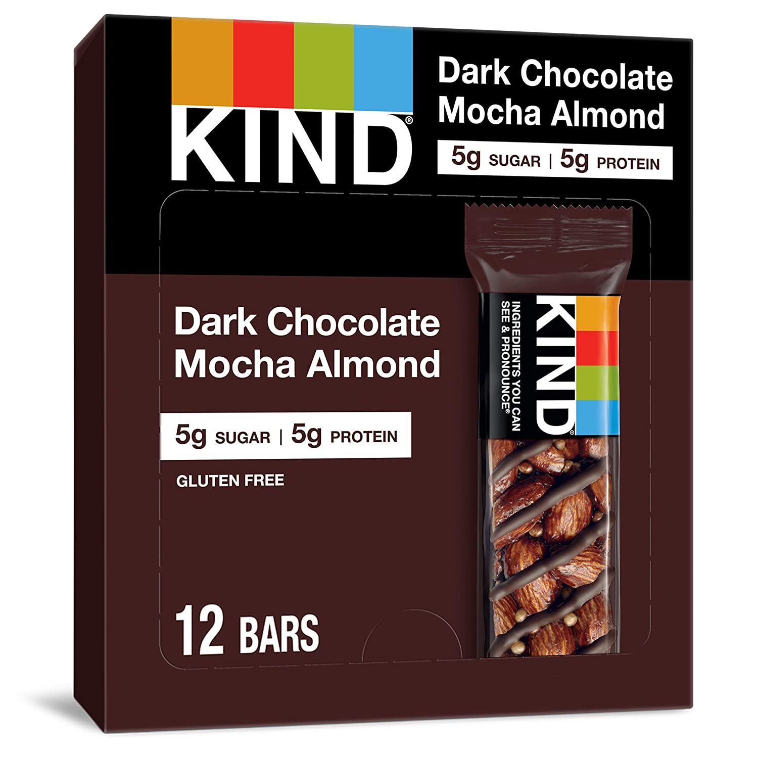 KIND Dark Chocolate Nuts & Sea Salt bars are satisfying gluten free bars packed with nuts and the taste of dark chocolate that you can take anywhere. These KIND nut bars lead with heart healthy almonds as the #1 ingredient. This healthy snack bar combines quality ingredients like almonds, dark chocolate, and sea salt to deliver a delicious taste with a little crunch. These snack bars come packed as individually wrapped snacks for a convenient option that makes eating healthy easier. It's the perfect nutrient-dense pick-me-up when life gets in the way. KIND bars Dark Chocolate Nuts & Sea Salt contain 5 grams of sugar, 6 grams of protein, and are a good source of fiber*. This KIND nut bar is also gluten free, has a low glycemic index, and is made without genetically engineered ingredients. *Contains 14g of fat per bar