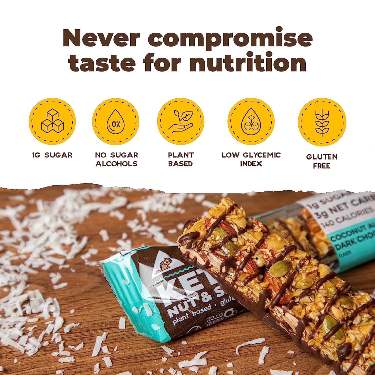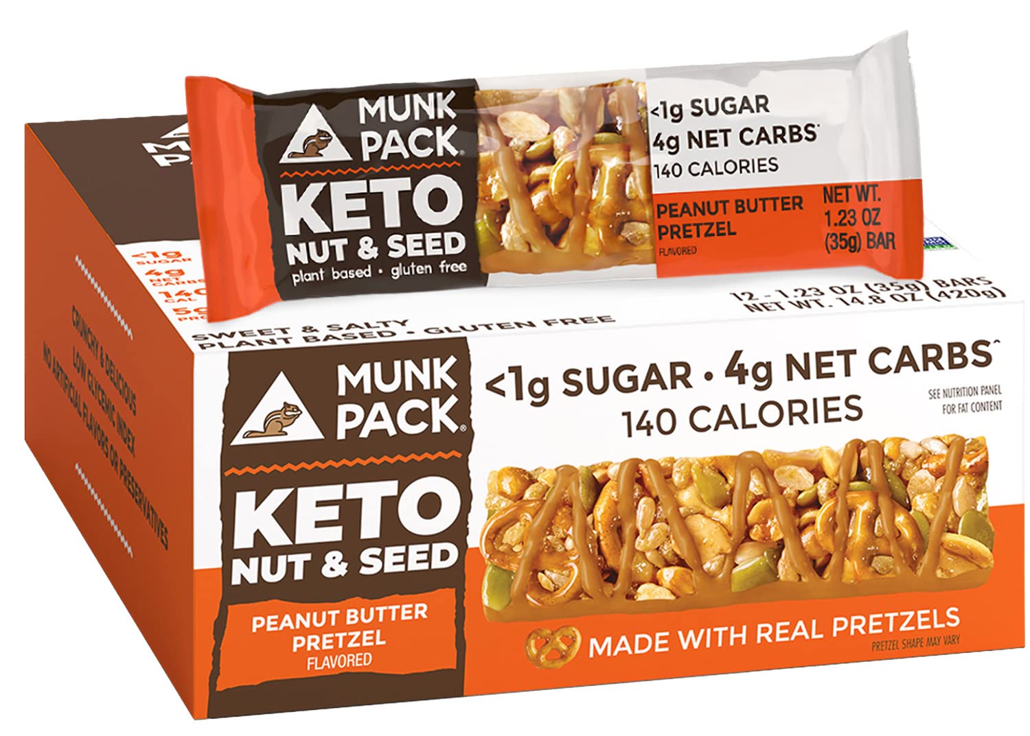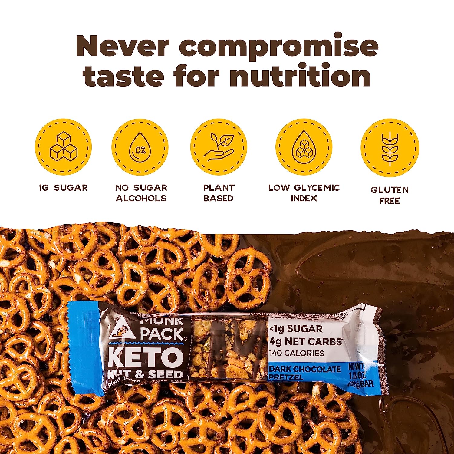 • GOOD FLAVOR ON-THE-GO: Available in a variety of delicious flavors such as Sea Salt Dark Chocolate, Peanut Butter Dark Chocolate, Dark Chocolate Pretzel, Peanut Butter Pretzel, Macadamia White Chocolate, Caramel Sea Salt, Coconut Almond Dark Chocolate, and Pumpkin Seed Cinnamon Almond, these bars contain only 2-3g net carbs, making them a quick and chewy low sugar, erythritol-free snack that won't ruin your diet.