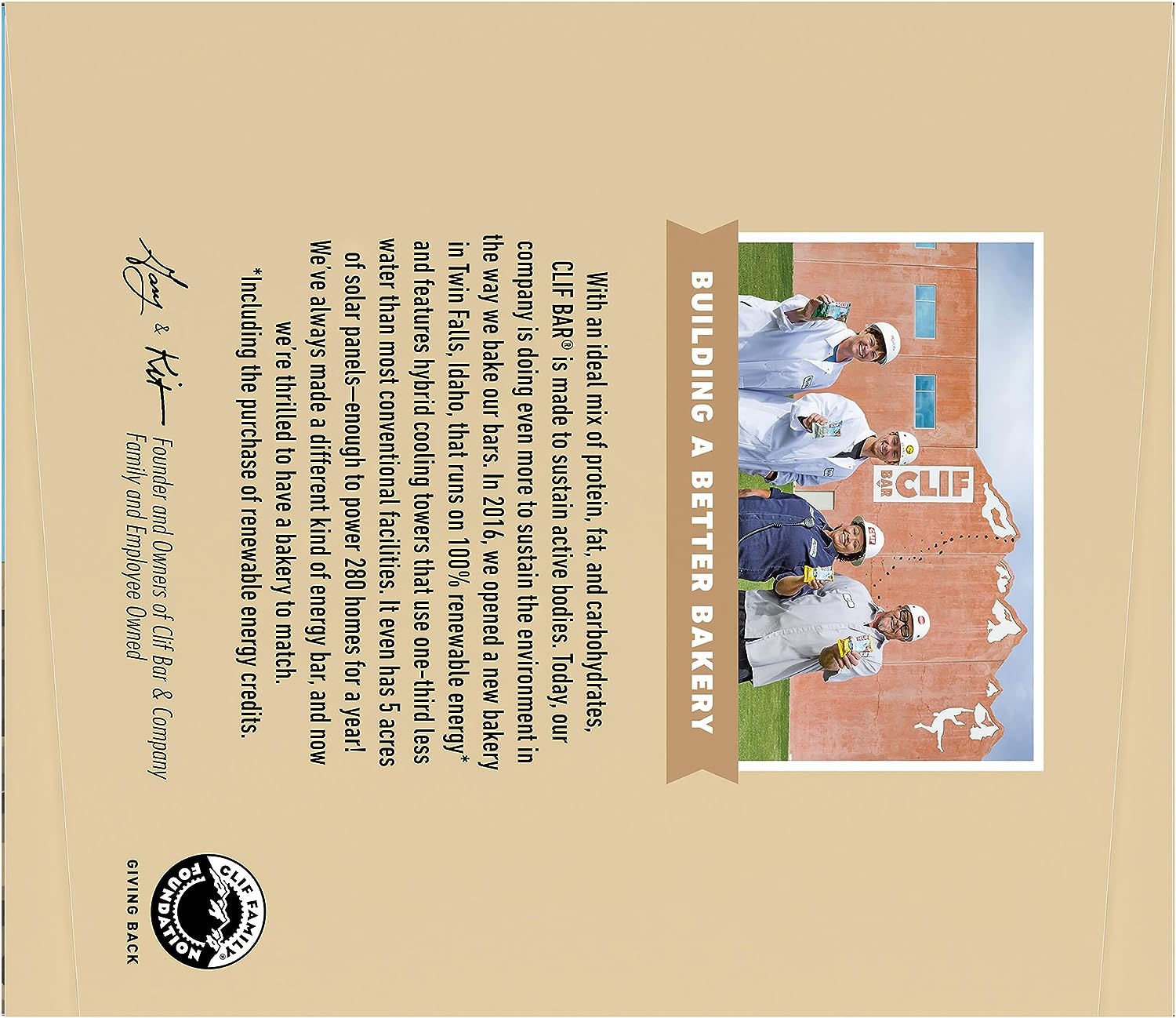 Born on a 175-mile bike ride and made with great-tasting and sustainably sourced whole food ingredients, CLIF BAR Energy Bars were crafted to sustain active bodies before and during long-lasting activity. Today, CLIF BAR remains the Ultimate Energy Bar. As part of Clif Bar & Company’s commitment to making products that are friendly to people and the environment, we use 100% renewable energy*, zero waste certified bakeries, and strive to be climate positive by 2030. We have also signed The Climate Pledge and are committed to be carbon neutral by 2040. CLIF BAR energy bars are non-GMO, with no high-fructose corn syrup or artificial flavors. *Including the purchase of renewable energy credits.