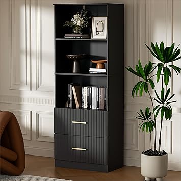 Black Bookshelf with Drawers, 63" Tall Bookshelf with Storage, 3 Shelf Bookcase with Adjustable Shelf, 3 Tier Modern Bookshelf, Open Shelves Bookcase, Unique Bookshelf for Bedroom & Office