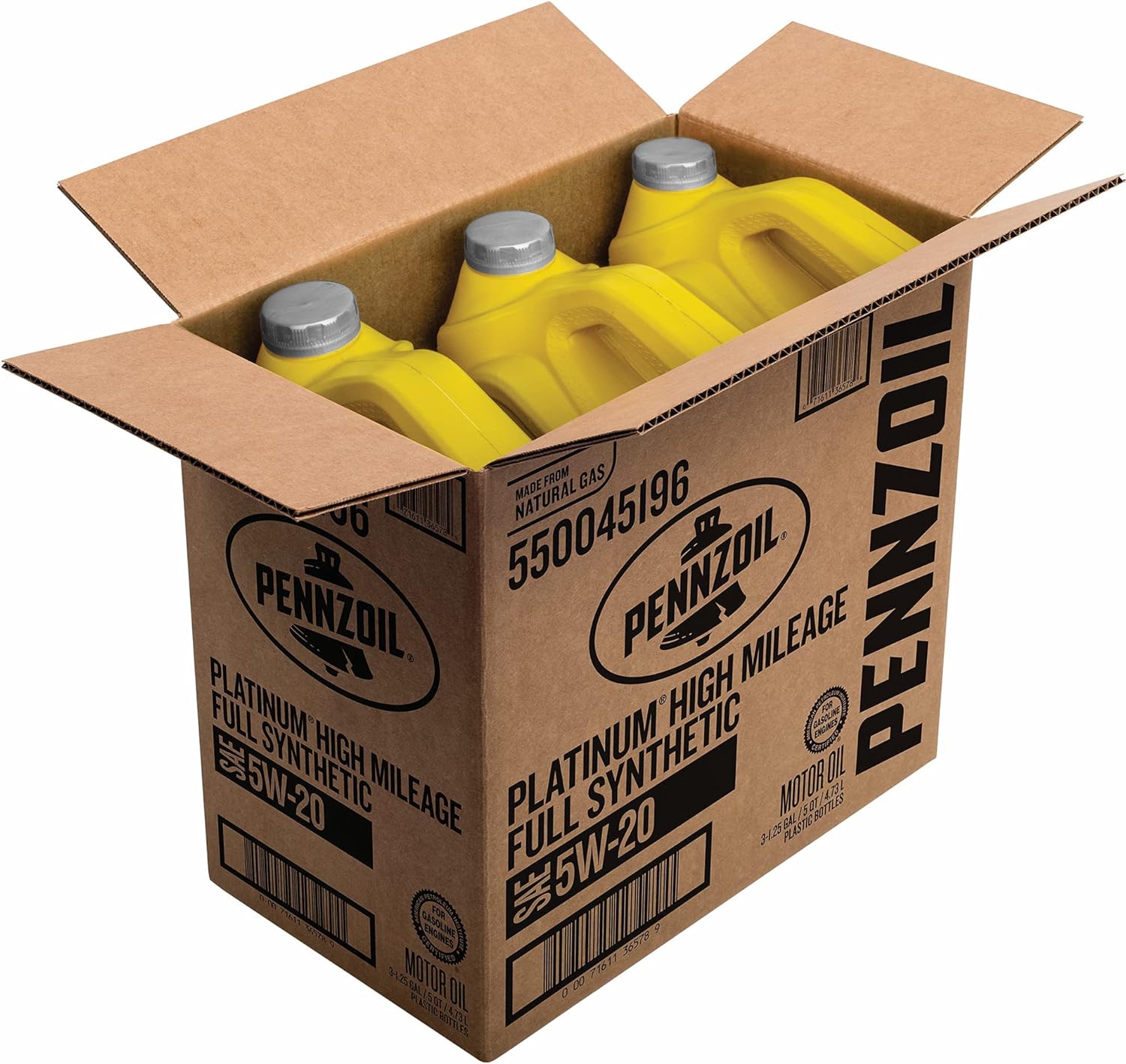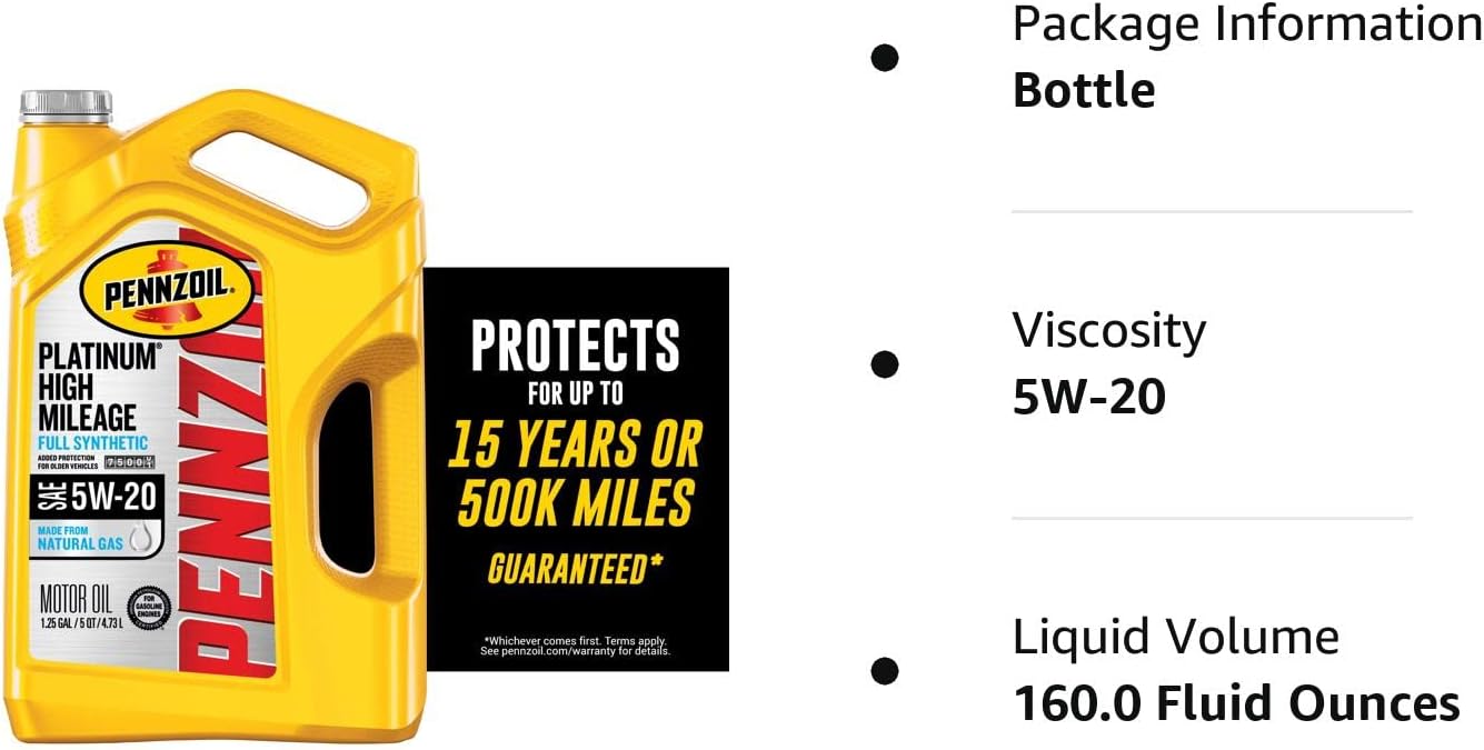 Pennzoil Platinum High Mileage SAE 0W-20 is a full synthetic motor oil made from natural gas, not crude oil. It is uniquely engineered from our revolutionary PurePlus gas-to-liquid technology which is a patented process that converts pure natural gas into a high quality, full synthetic base oil. Because it is made from natural gas, the base oil contains fewer impurities than base oils made from crude oil, and when combined with our advanced additive technology, creates one of the best formulations in our Pennzoil high mileage portfolio. As your car ages, leaks may develop and cause higher oil consumption and oil burn-off, potentially causing your engine to need frequent top-offs. Pennzoil Platinum High Mileage motor oil is enhanced with an excellent combination of special conditioning seal agents and additives to help stop leaks from seals and reduce the oil consumption that is typical of older and worn engines. Our full synthetic high mileage motor oil also protects engines from loss of horsepower, offers excellent performance in extreme temperatures, provides unsurpassed wear protection (based on Sequence IVA wear test using SAE 5W-30), and protection against abnormal combustion phenomenon like low-speed pre-ignition observed in modern turbocharged gasoline direct injection (TGDI) engines. Pennzoil Platinum High Mileage SAE 0W-20 is engineered to help keep engines clean by gently lifting deposits and keeping them away from critical moving engine parts In fact, it keeps pistons up to 45% cleaner than the toughest industry standards (based on Sequence IIIH results). This product is carbon neutral. The CO2e emissions of the lifecycle of this product have been offset with verified Nature Based Carbon Credits. For full details visit the Pennzoil website. "Carbon Neutral” indicates that the CO2e lifecycle emissions of this product have been offset with verified nature-based carbon credits. This means that Shell has engaged in a transaction where an amount of carbon dioxide equivalent (CO2e) that is associated with the raw material extraction, transport, production, distribution, use, and end-of-life of the lubricant has been removed from the atmosphere through a nature-based process, or emissions were saved through the avoided degradation of natural ecosystems. "CO2e (CO2 equivalent) emissions” means CO2, CH4, N2O greenhouse gas emissions. It meets or exceeds the following OEM requirements: FCA MS-6395; Ford WSS-M2C947-B1. It also exceeds the requirements of the following industry specifications: API SP and all previous categories; ILSAC GF-6. For a full list of equipment approvals and recommendations, please consult your local Shell Technical Help Desk and always consult your owner’s manual.