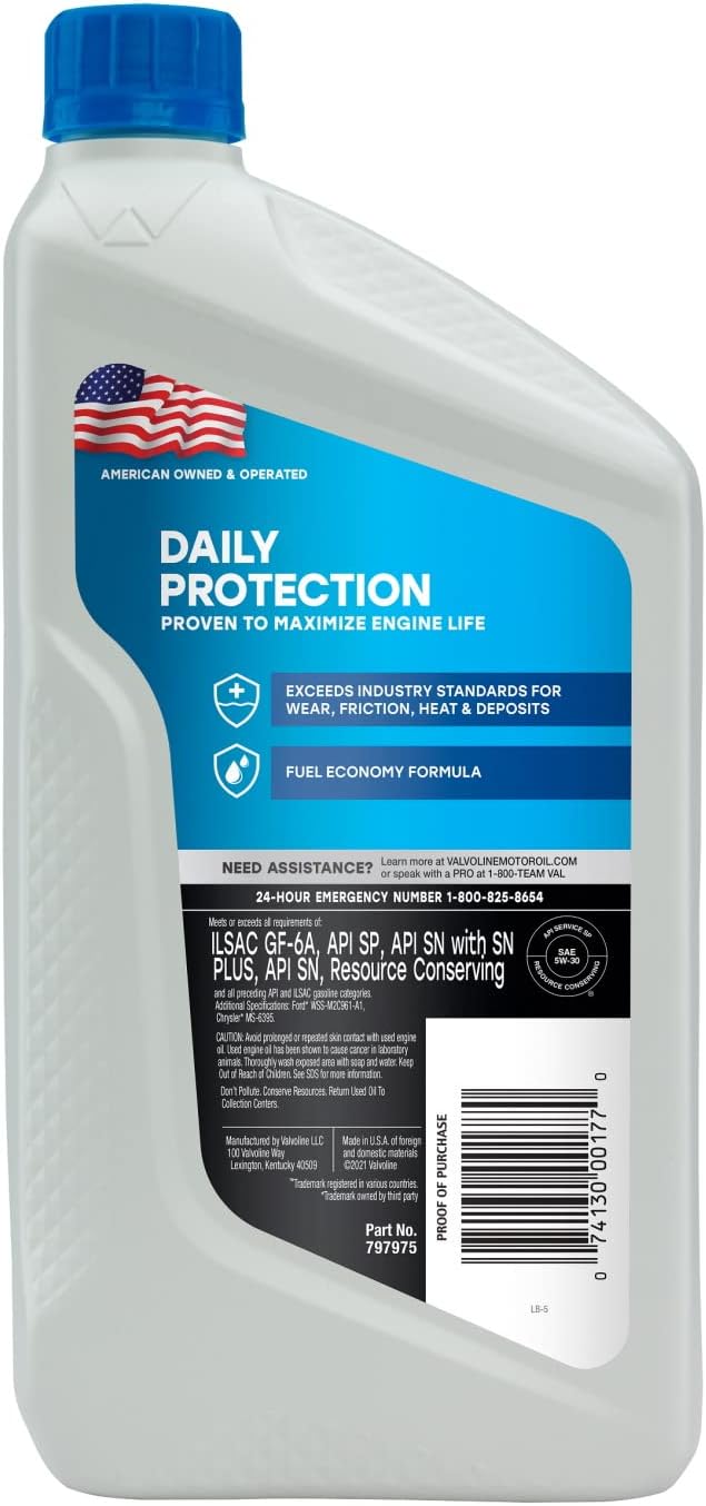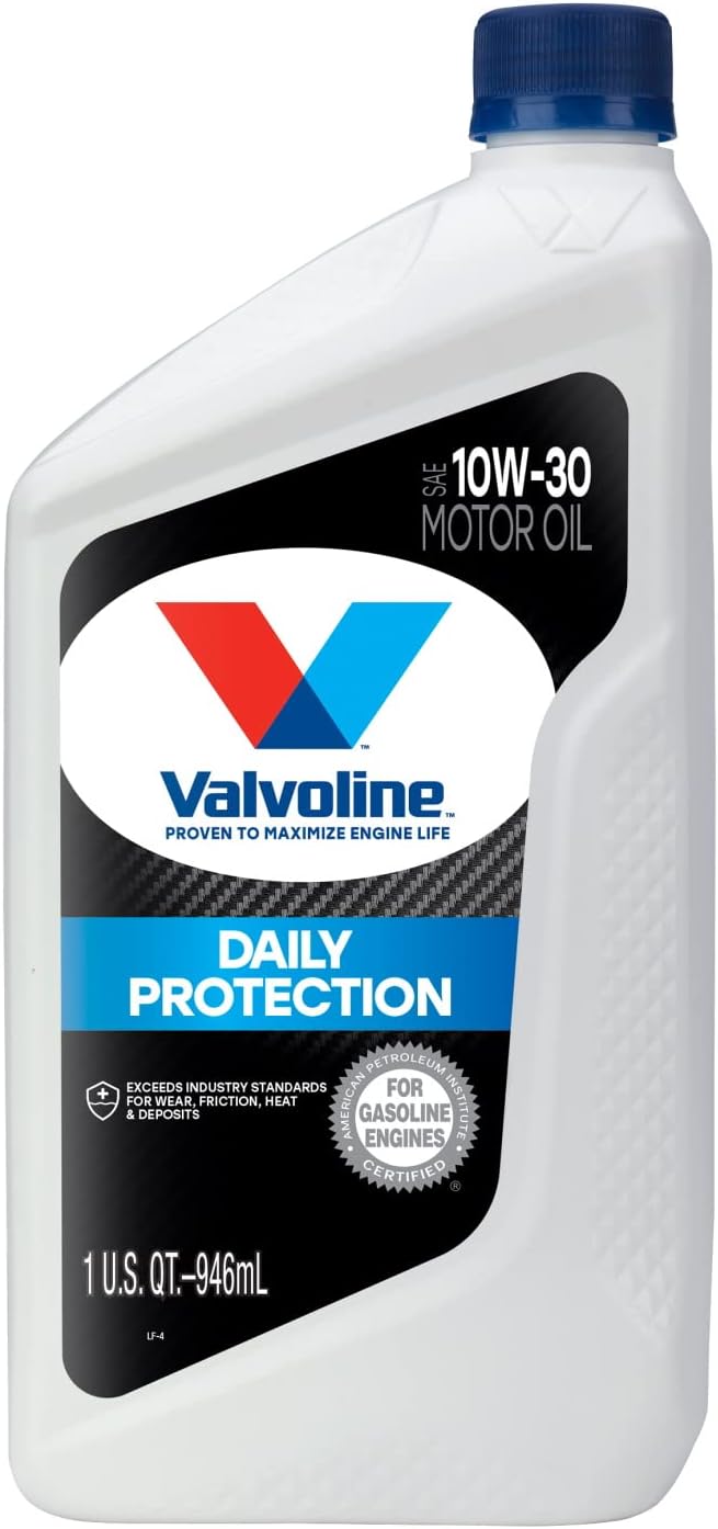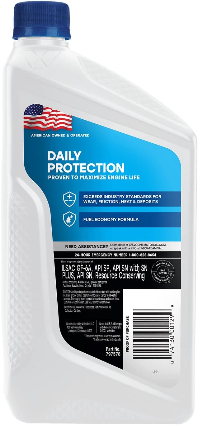 Valvoline Daily Protection Motor Oil is specially formulated to exceed industry standards for wear, deposit and sludge protection to help keep engines running like new. Developed with high quality additives and premium base oils, it’s designed to flow easily at cold temperatures, reducing wear at startup and providing added protection against motor oil breakdown in tough conditions. For enhanced fuel efficiency, choose Daily Protection Synthetic Blend 5W-20 or 5W-30. Developed with low-friction technology to support strong fuel economy.