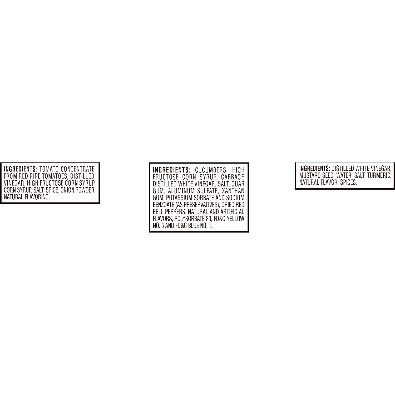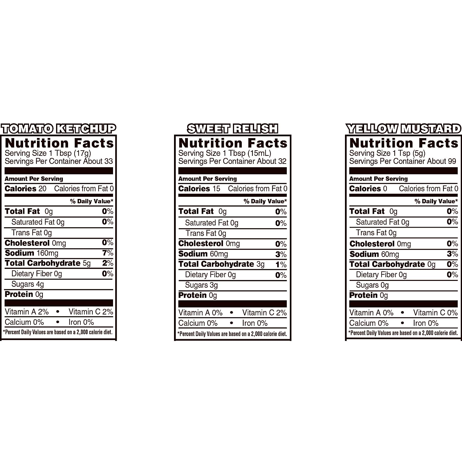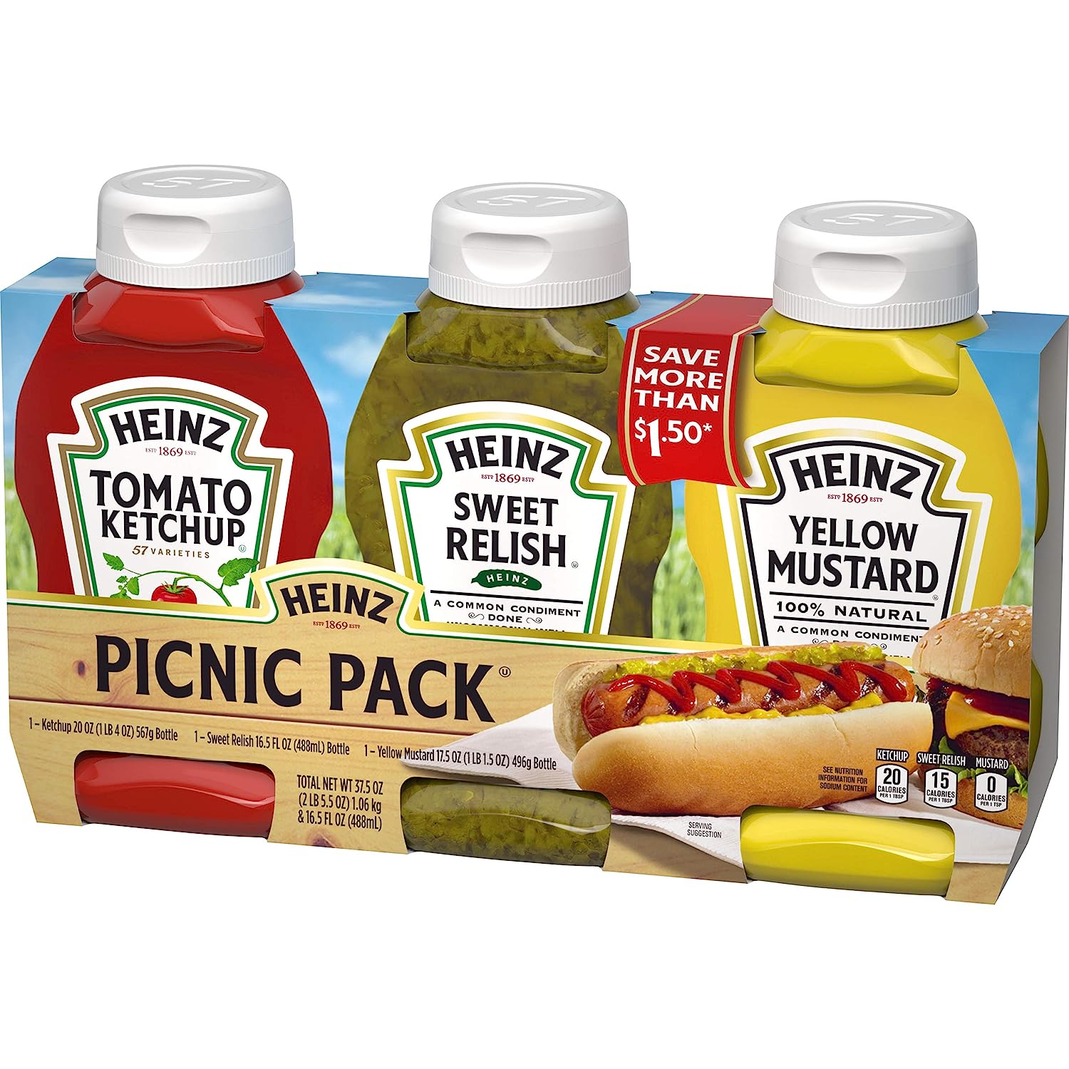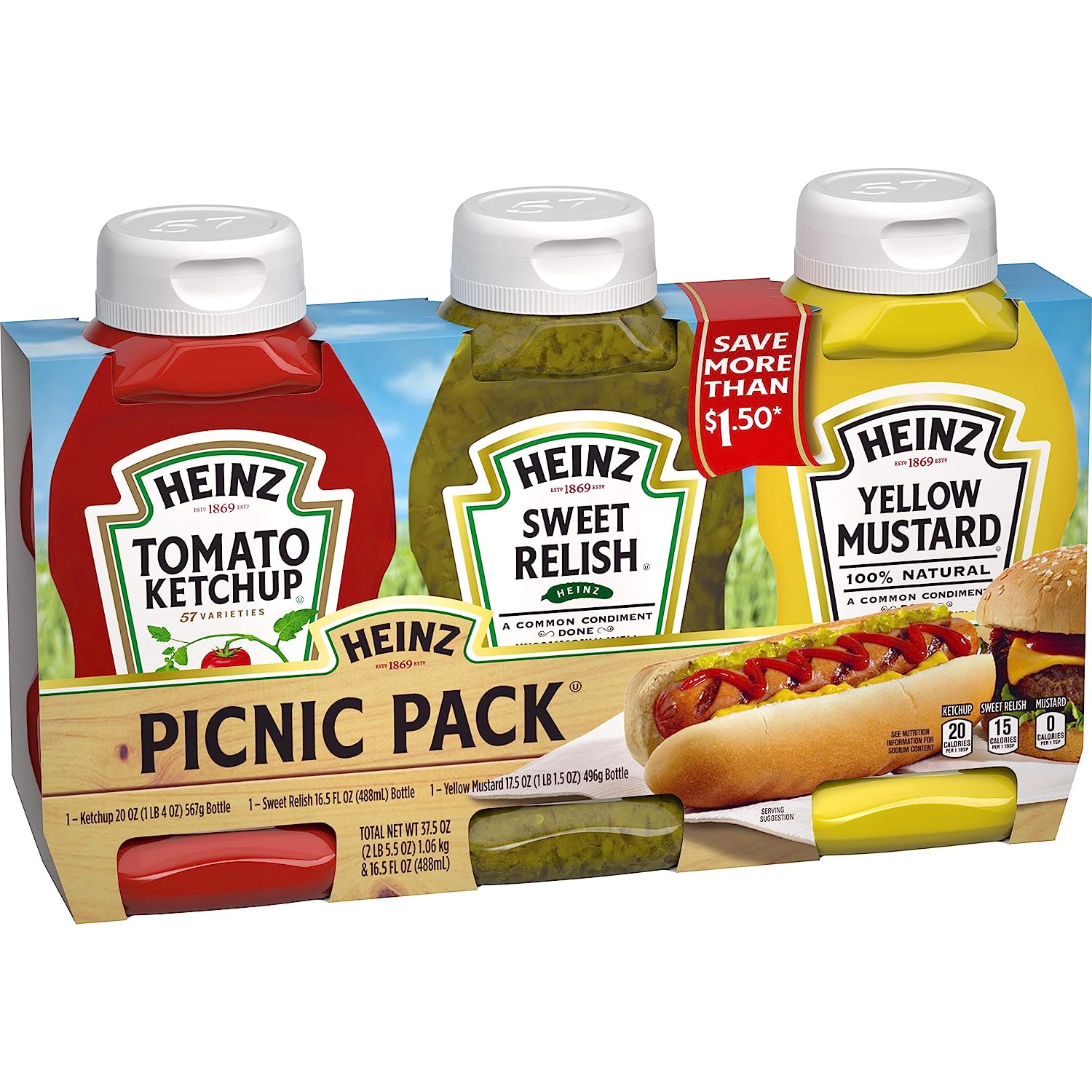 Heinz Ketchup, Sweet Relish & Yellow Mustard Picnic Pack is the thick & rich ketchup, sweet relish and tangy yellow mustard you love in a convenient variety pack. Use this 54 ounce condiment variety pack to create the perfect hot dog or hamburger. Heinz Ketchup, Sweet Relish & Yellow Mustard are packed in easy squeeze bottles with flip caps for clean and easy serving, making them the perfect bottled condiments for family picnics, barbecues, and camping trips. This picnic pack includes one 20 ounce bottle of tomato ketchup, one 16.5 fluid ounce bottle of sweet relish and one 17.5 ounce bottle of yellow mustard. Whatever the occasion, youll feel good serving your family Heinz Ketchup, Sweet Relish & Yellow Mustard.