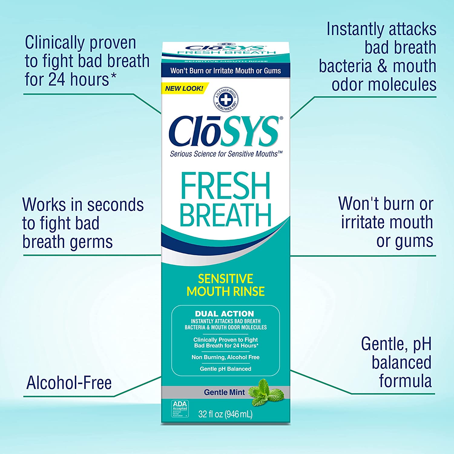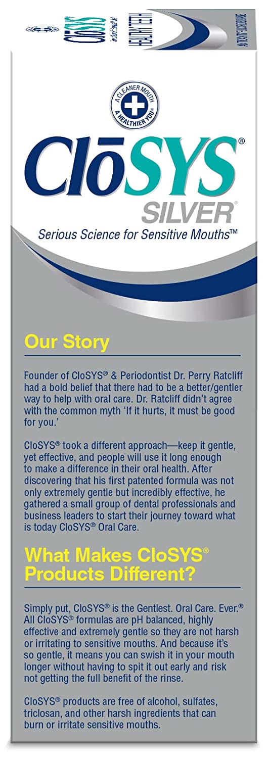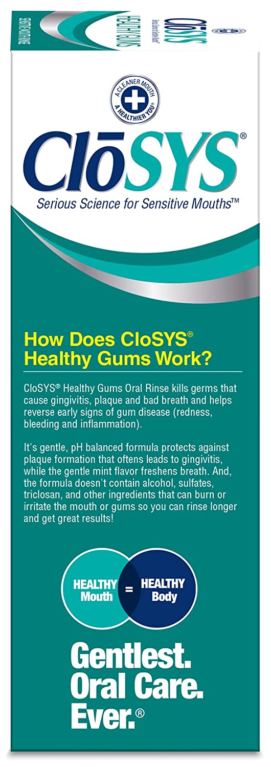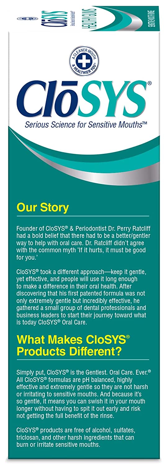 Why does most mouthwash burn and irritate? It doesn’t have to hurt to be effective. With CloSYS Mouthwashes you can protect your mouth from harmful bad breath germs and freshen your breath without the painful burn. CloSYS is one of the first mouthwashes to receive the American Dental Association seal for reducing bad breath. This gentle but powerful mouthwash is perfect for all ages because its patented formula is pH balanced and so gentle you’ll actually use it longer for better results. A 30-second rinse in the morning and evening after each brushing is easy, and all it takes to get great results. CloSYS Sensitive Mouthwash comes mildly flavored with a touch of gentle mint. Nothing overpowering or painful. Just a clean, fresh, soothing mouthwash you’ll actually use, because CloSYS is the Gentlest Oral Care Ever.