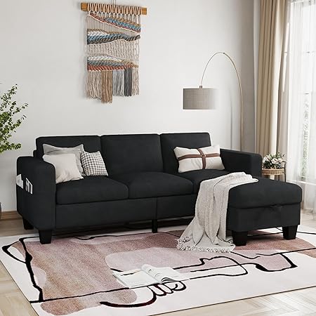 78'' Convertible Sectional Sofa Couch, Black 3 Seat L-Shaped Couch with Storage Ottoman, Modern Velvet Fabric Couches for Living Room, Apartment, Office, Small Space