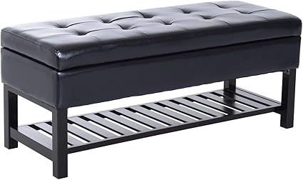 HOMCOM 44" Tufted Faux Leather Ottoman Storage Bench with Shoe Rack - Black