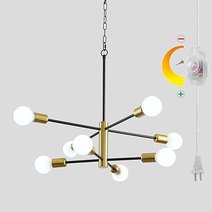 8-Light Plug in Chandelier, Sputnik Chandelier with Cord Modern Industrial E26 Black and Gold Pendant light Hanging Lights Ceiling Lighting Fixture for Living Room, Bedroom, Dining Room, Kitchen