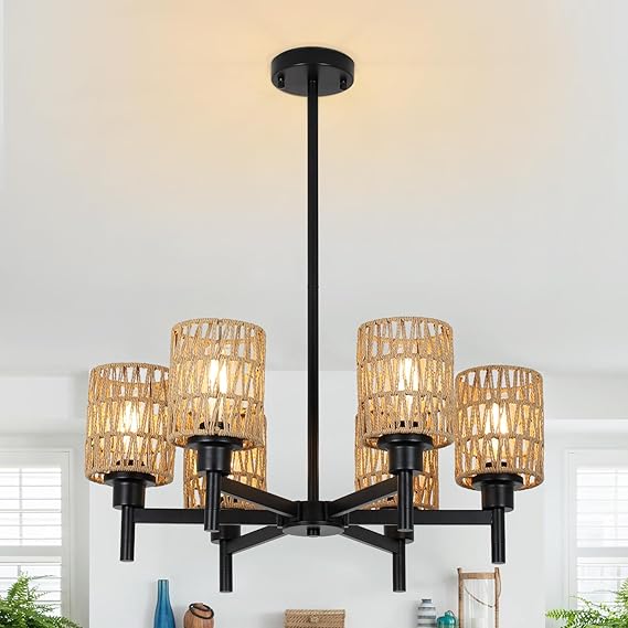 Airposta Rattan Farmhouse Chandelier for Dining Room, Black Pendant Lights Kitchen Island Lighting, Boho Chandeliers Ceiling Hanging Lamp, Rustic Dining Room Light Fixture for Living Room Bedroom Hall