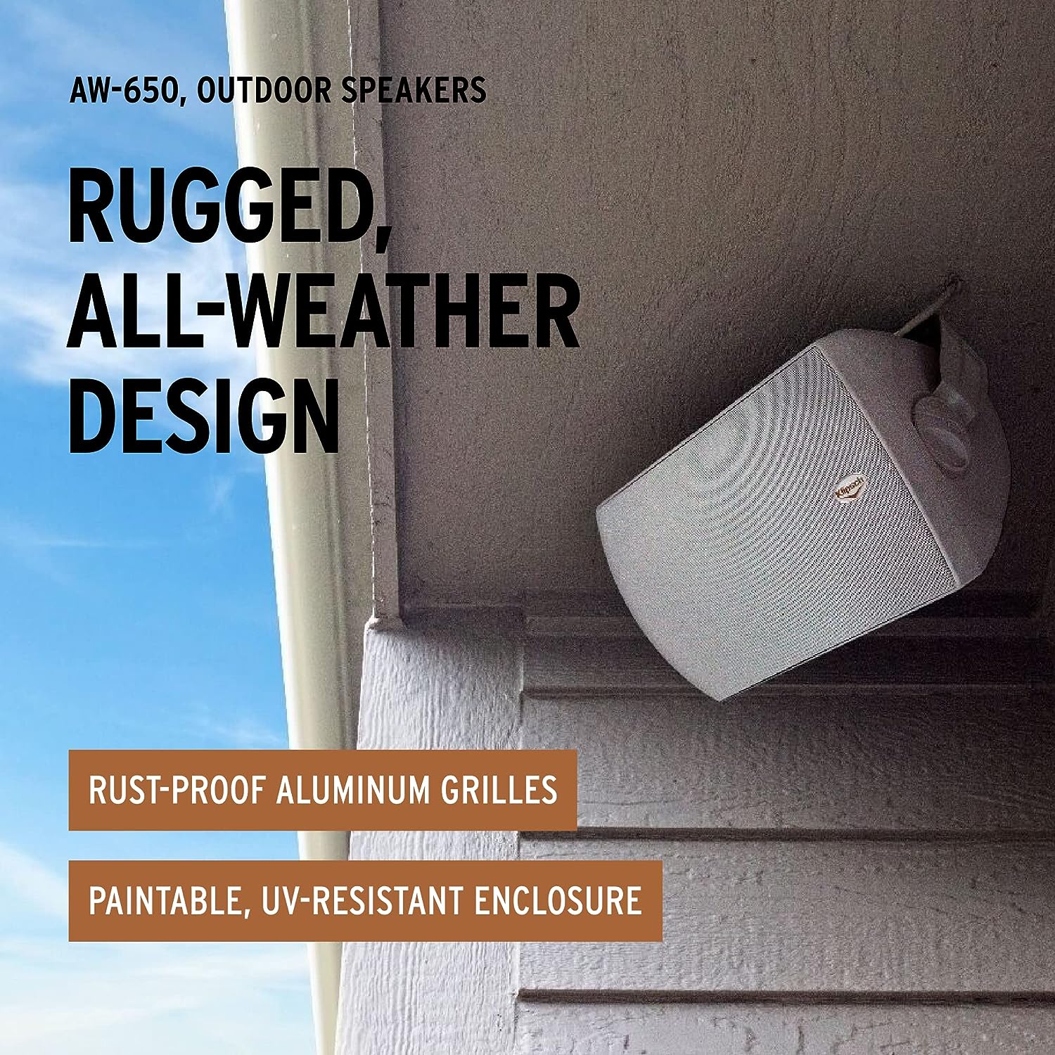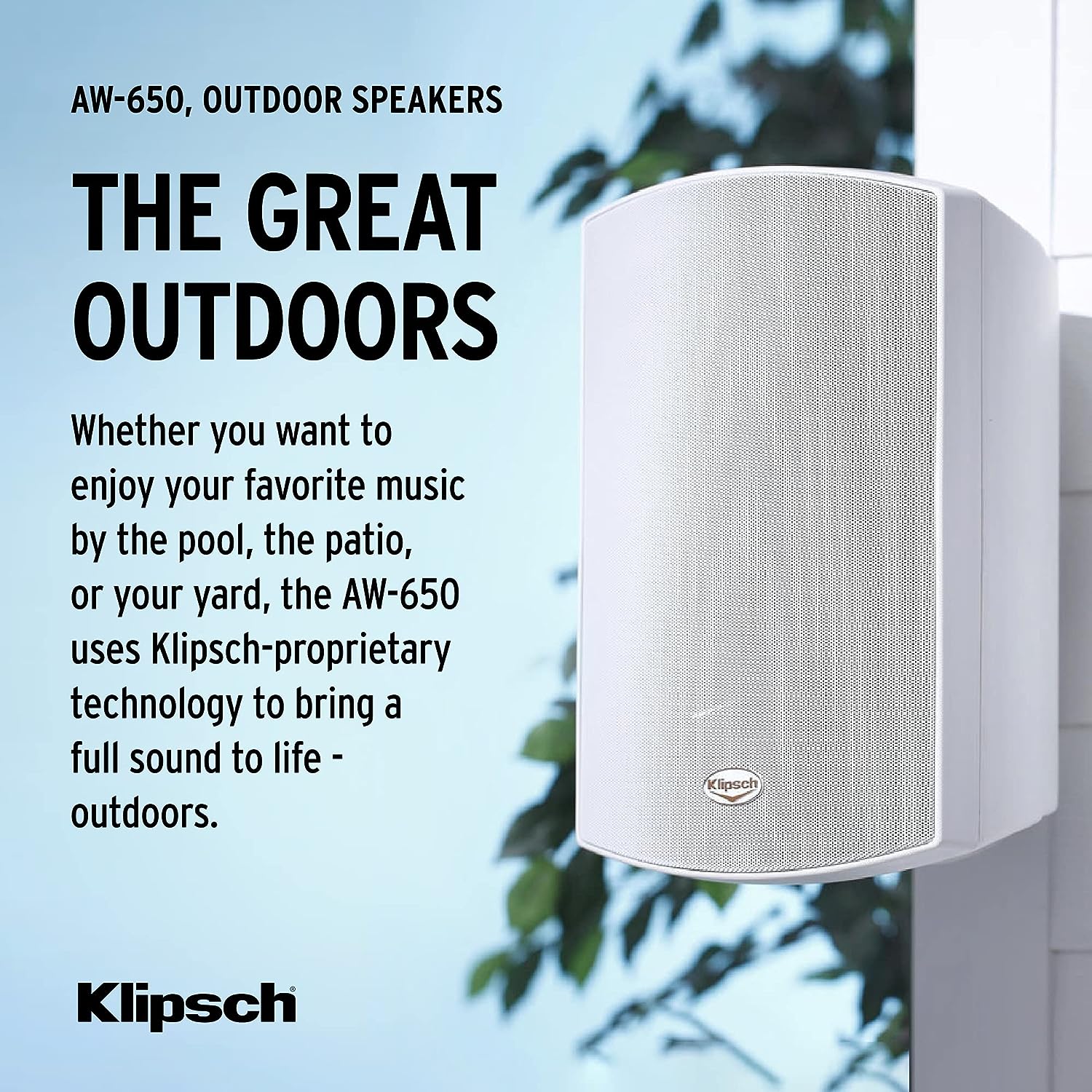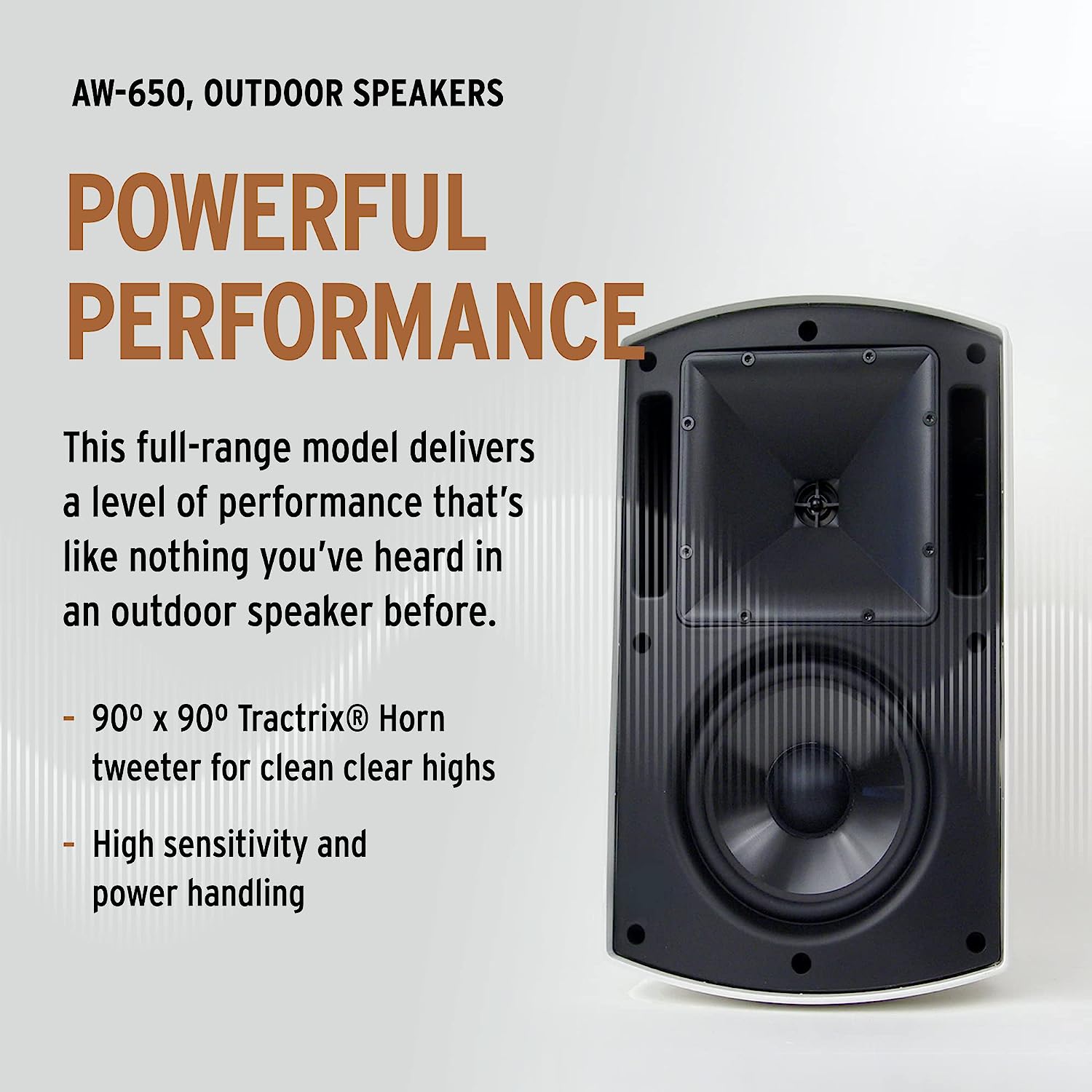 The durable Klipsch AW-650 all-weather loudspeaker brings clean, clear, dynamic sound and worry-free performance to the great outdoors. The AW-650 typically handles 85 watts of power at 8 ohms, with peak handling of 340 watts. Yet because it's so efficient, you get even more sound per watt, enabling this full-range model to work well in wide-open spaces.