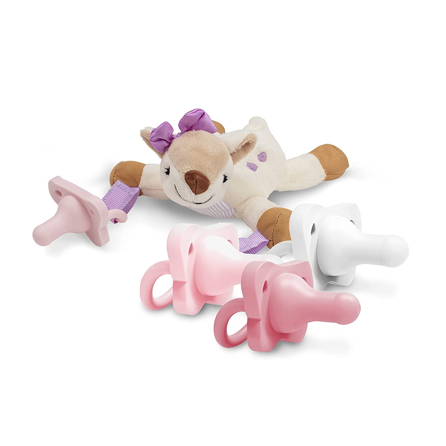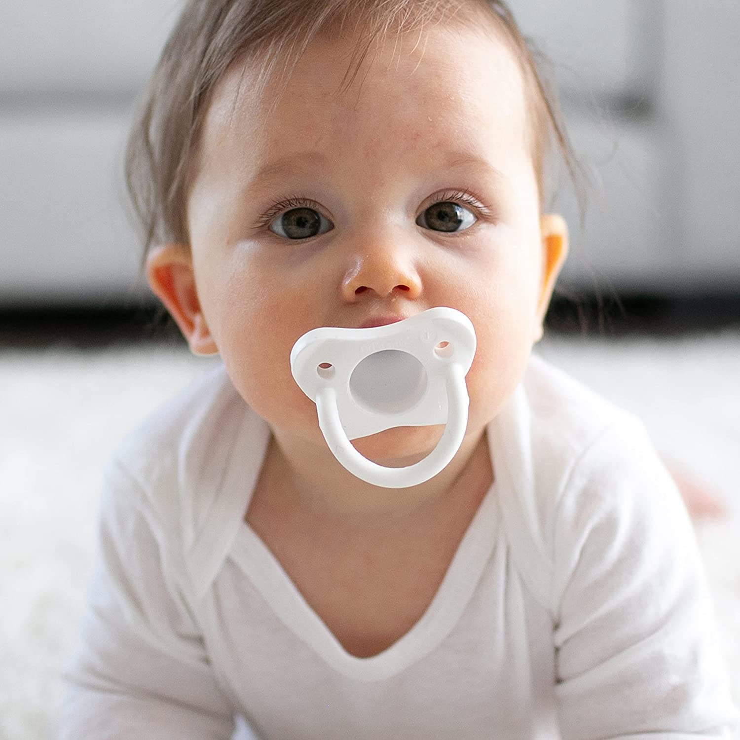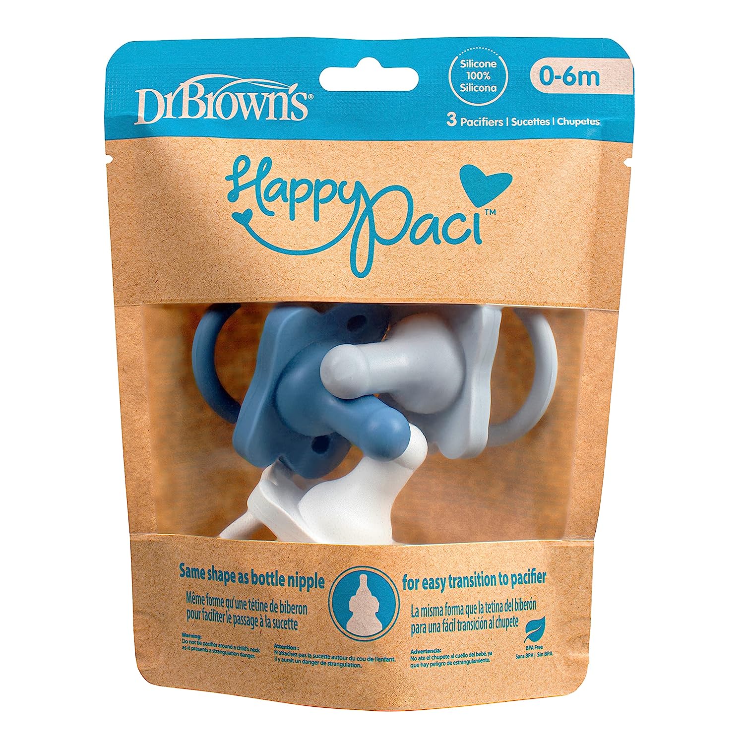 Contains: Dr. Brown’s HappyPaci 100% Silicone Pacifier 0-6m, BPA Free, White, Pink, Light Pink 3-Pack Soothing baby is simplified with Dr. Brown’s HappyPaci - the soft silicone pacifier shaped like Dr. Brown’s bottle nipple. Introducing baby to a pacifier is made easy with the familiar Dr. Brown’s shape baby is used to. Plus, moms love the one-piece construction of the HappyPaci. This lightweight, 100% silicone pacifier features a contoured butterfly-shaped shield that curves away from baby’s face for comfort, providing plenty of room for little noses and cheeks. Easy clean, dishwasher (top rack) and sterilizer safe. Comes in a variety of colors. BPA free. 0-6m