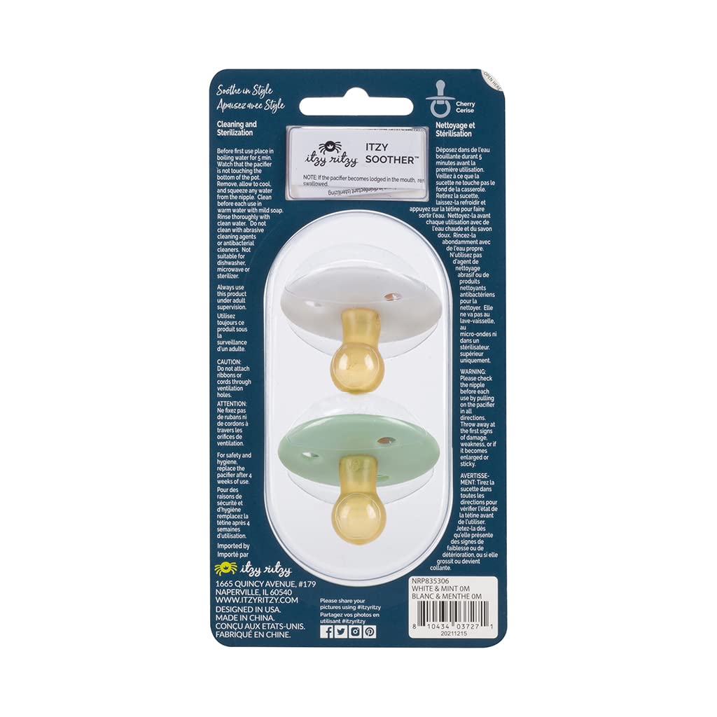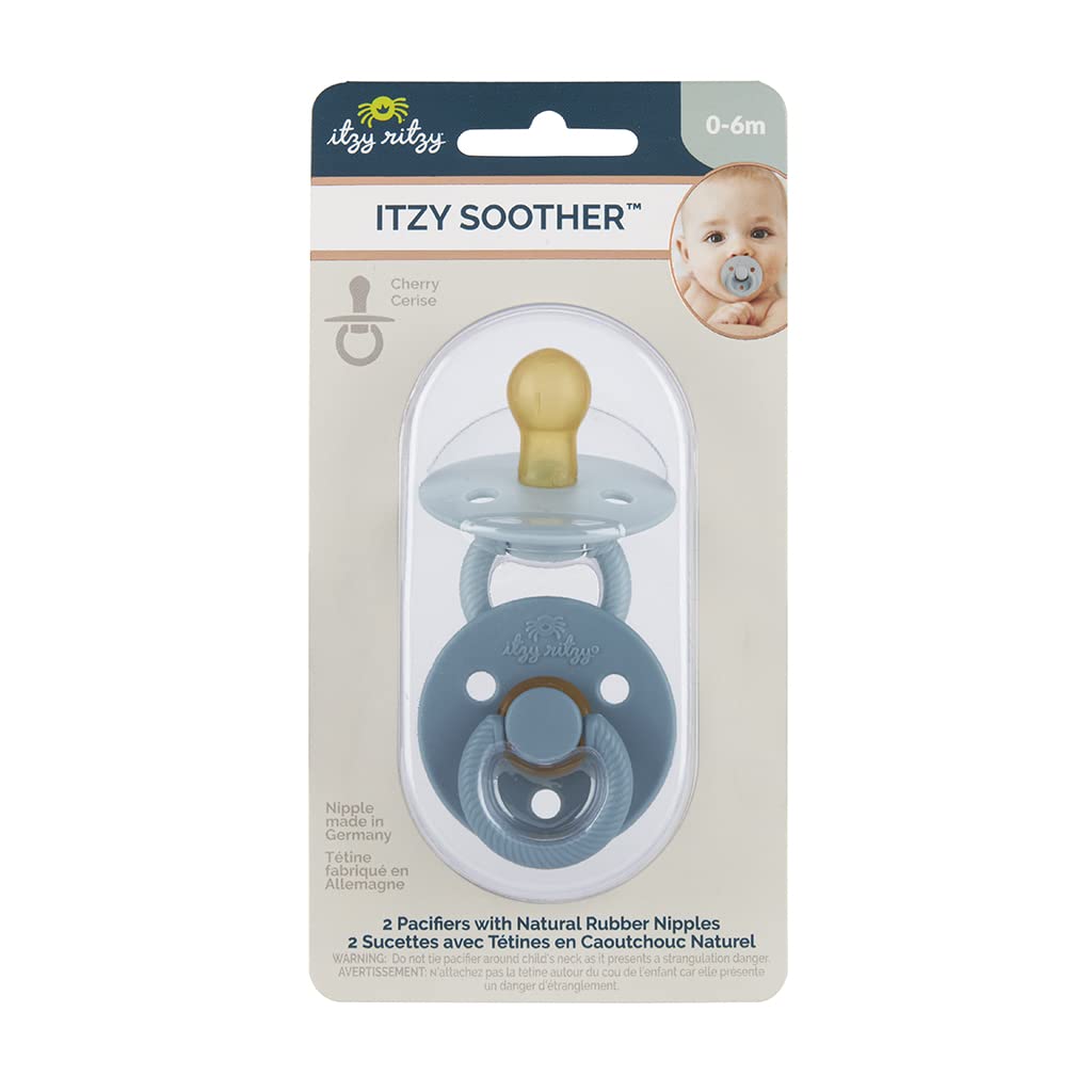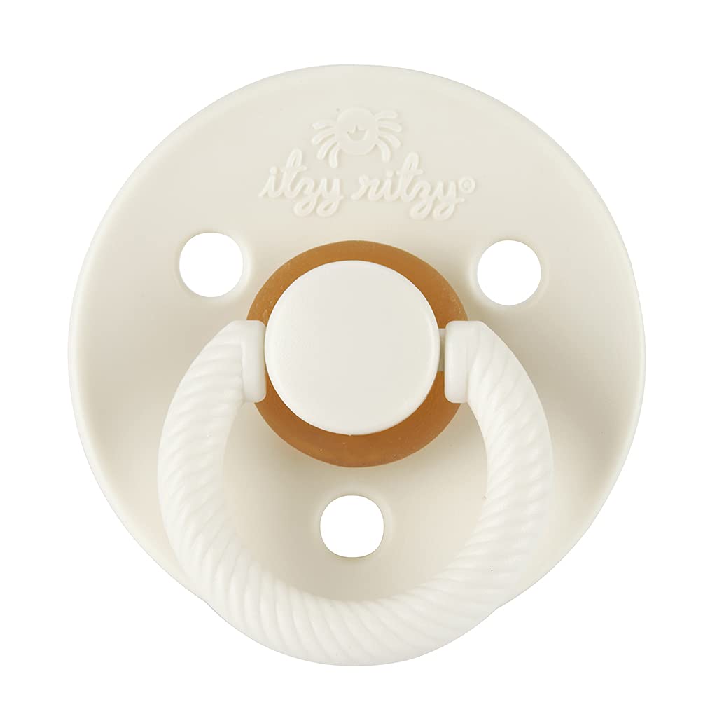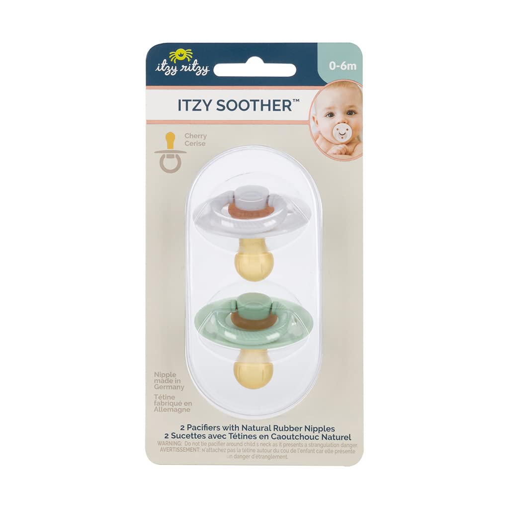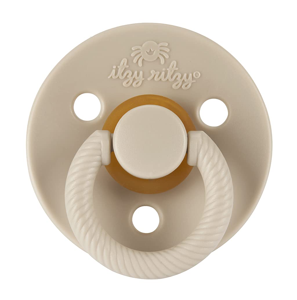 Help soothe your sweetie in style with these adorable rubber pacifiers from Itzy Ritzy! Their cherry-shaped natural rubber nipple is designed to mimic the feel of breastfeeding, and each pacifier features a cable accent on the security handle to coordinate with baby’s outfits. Our pacifiers meet ASTM safety standards and include large vent holes for breathability. If attaching a pacifier clip to a pacifier, we recommend security it around the handle and not through the air hole for safety. Available in a two-pack including one coconut and one toast, these pacifiers are ideal for babies from 0 – 6 months of age. Not suitable for dishwasher, microwave or sterilizer.
