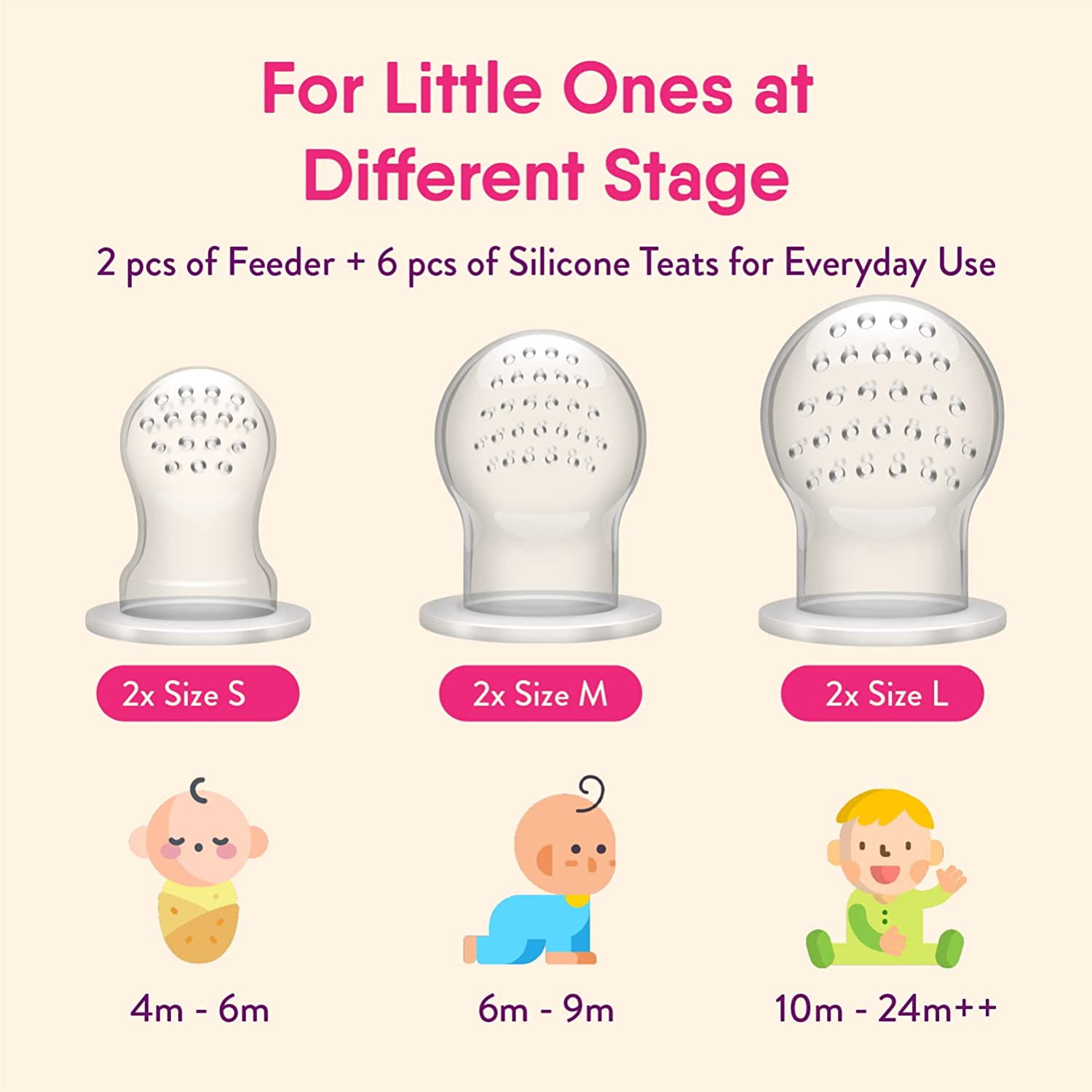 • ★ ALL SIZES INCLUDED – 2 x Feeders and Bonus pack of 6 silicone sacs / teats for different ages of baby/toddlers. (2 Large Sizes Sacs are pre-packed with Feeders. Additional 2 Small Sizes and 2 Medium Size included for parents to have more options). We value you and your baby's comfort and convenience. Unlike other feeders which do not provide different sizes, we recommend customers to use an appropriate size for your little ones.