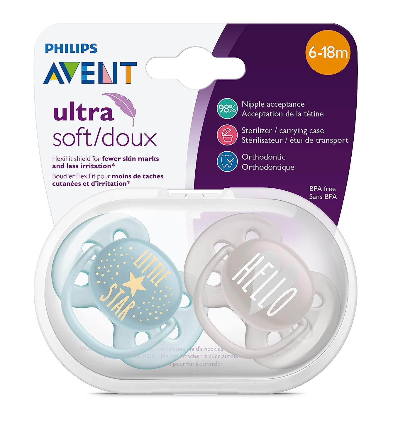 The Philips AVENT SCF214/40 ultra soft pacifier for babies 0-6 months is designed with a FlexiFit shield for fewer skin marks and less skin irritation. This makes it a more comfortable choice for baby. 98% of babies accept the nipple. It comes with 4 pacifiers packaged in 2 sterilizer/ carrying cases that can be used to sterilize them with water in the microwave.
