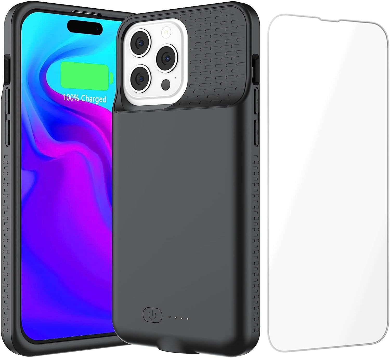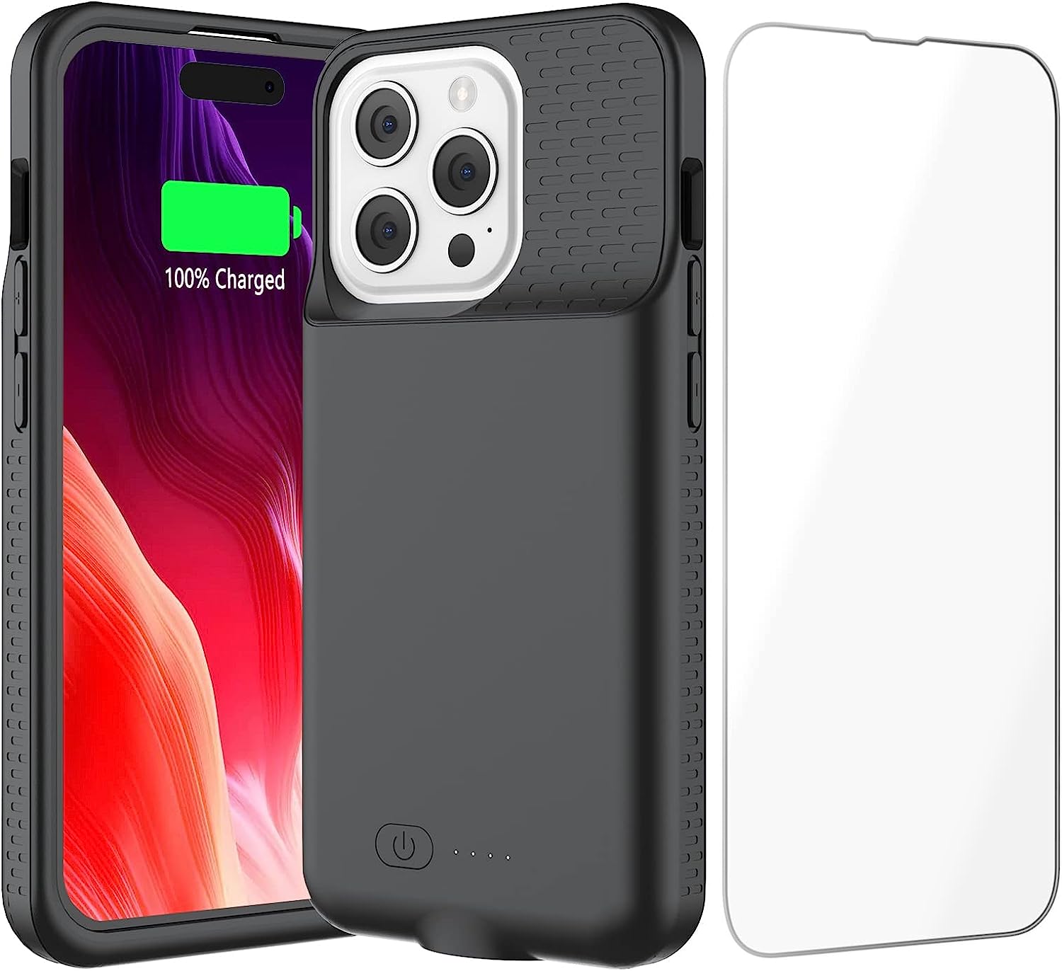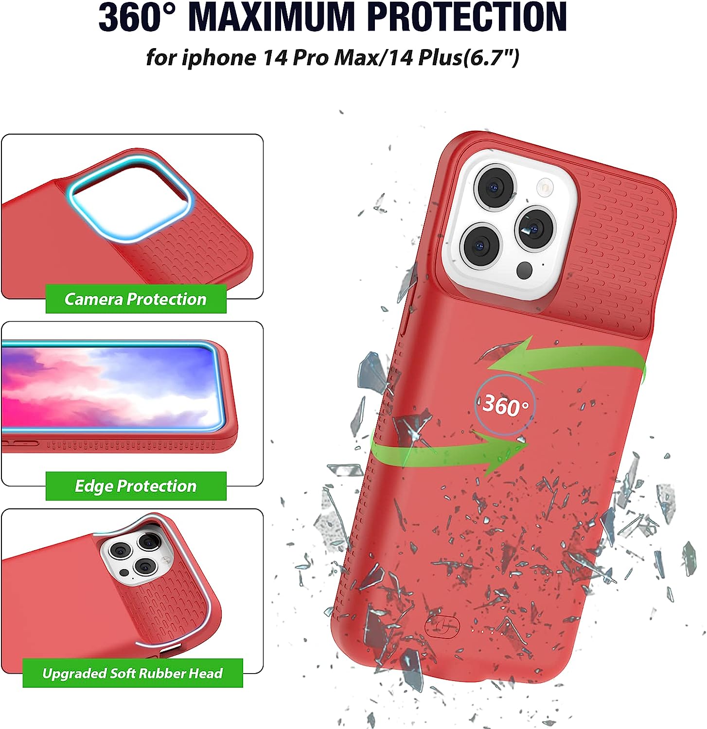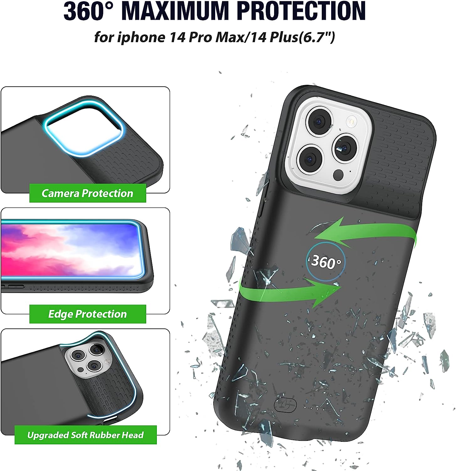 • ⚡【10 HEAVY SECURITY PROTECTION, BETTER PROTECT YOUR PHONE】🔋Built-in smart charging internal chip protect both your iPhone and battery charging case from over-charge, over-discharge, over-heat, over-current, short-circuit, etc. Certificated by CE, UL,FC and RoHs. 360° full bumper design and hard shell back to protect your phone from scratches and other daily wear and tear. Raised bezels offer front and surface protection. Tempered Glass screen protector included for full frontal protection.