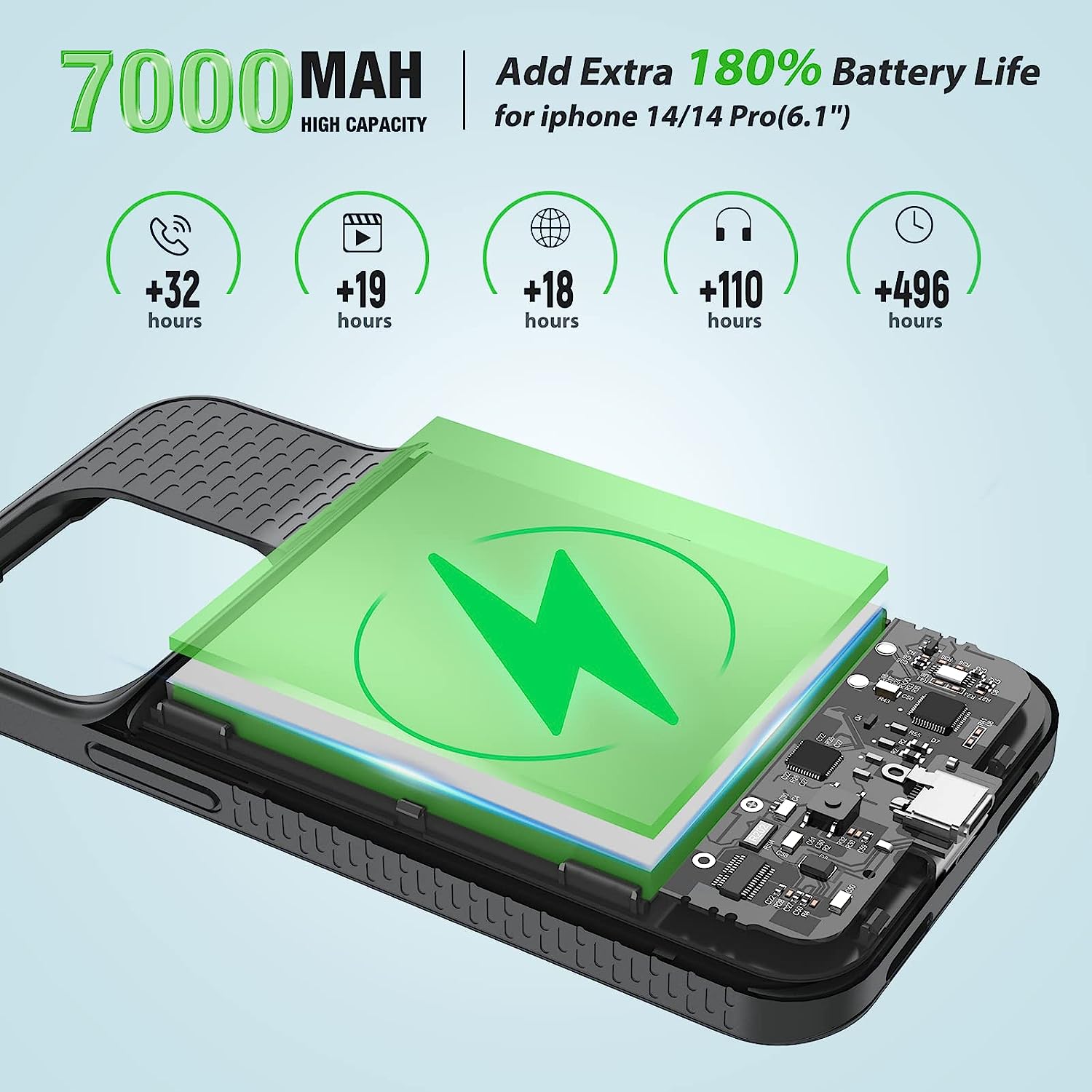 GIN FOXI Battery Case for iPhone 14/14 Pro, Real 7000mAh Ultra-Slim Battery Charging Case Rechargeable Anti-Fall Protection Extended Charger Cover for iPhone 14 Pro/14 Battery Case(6.1 inch)-Black