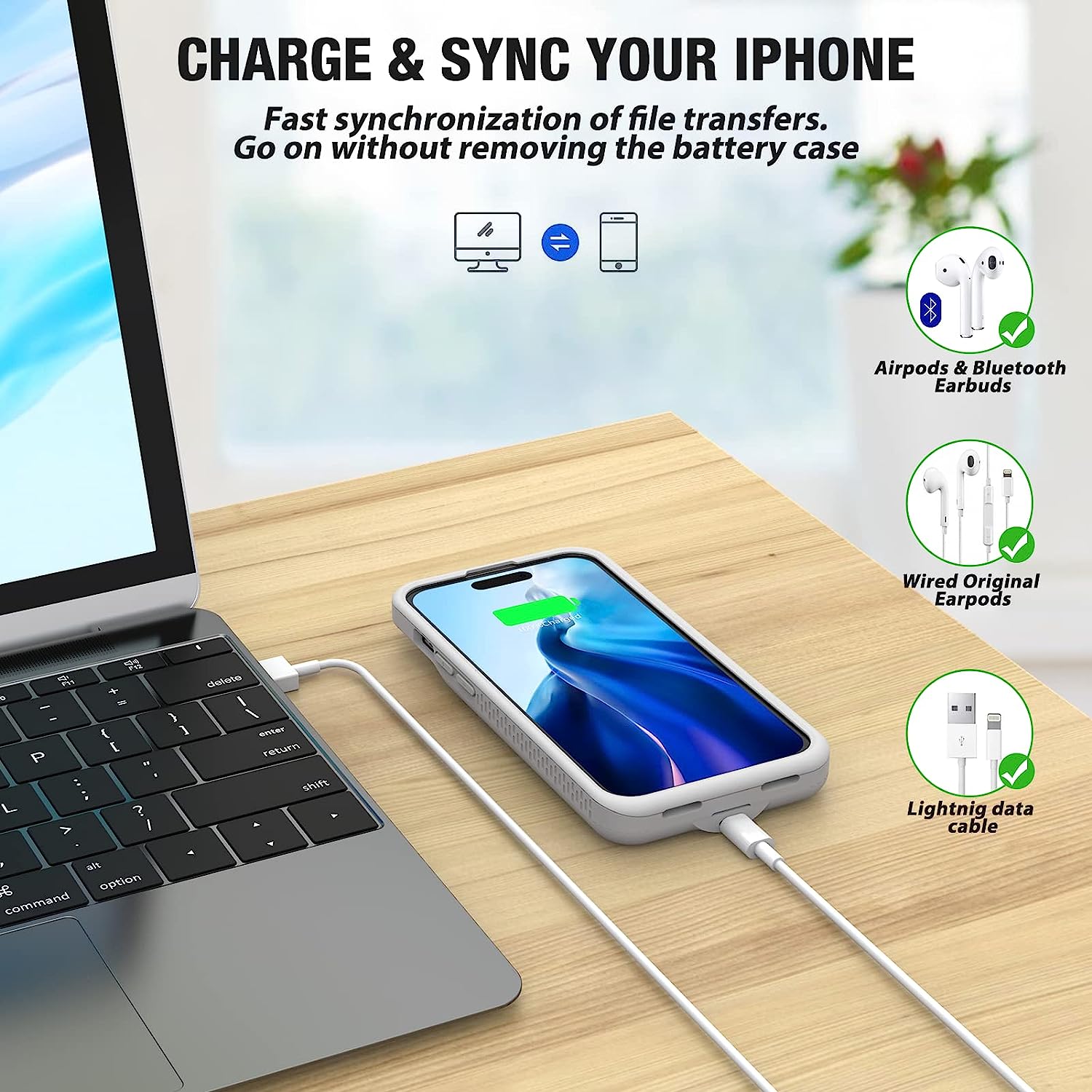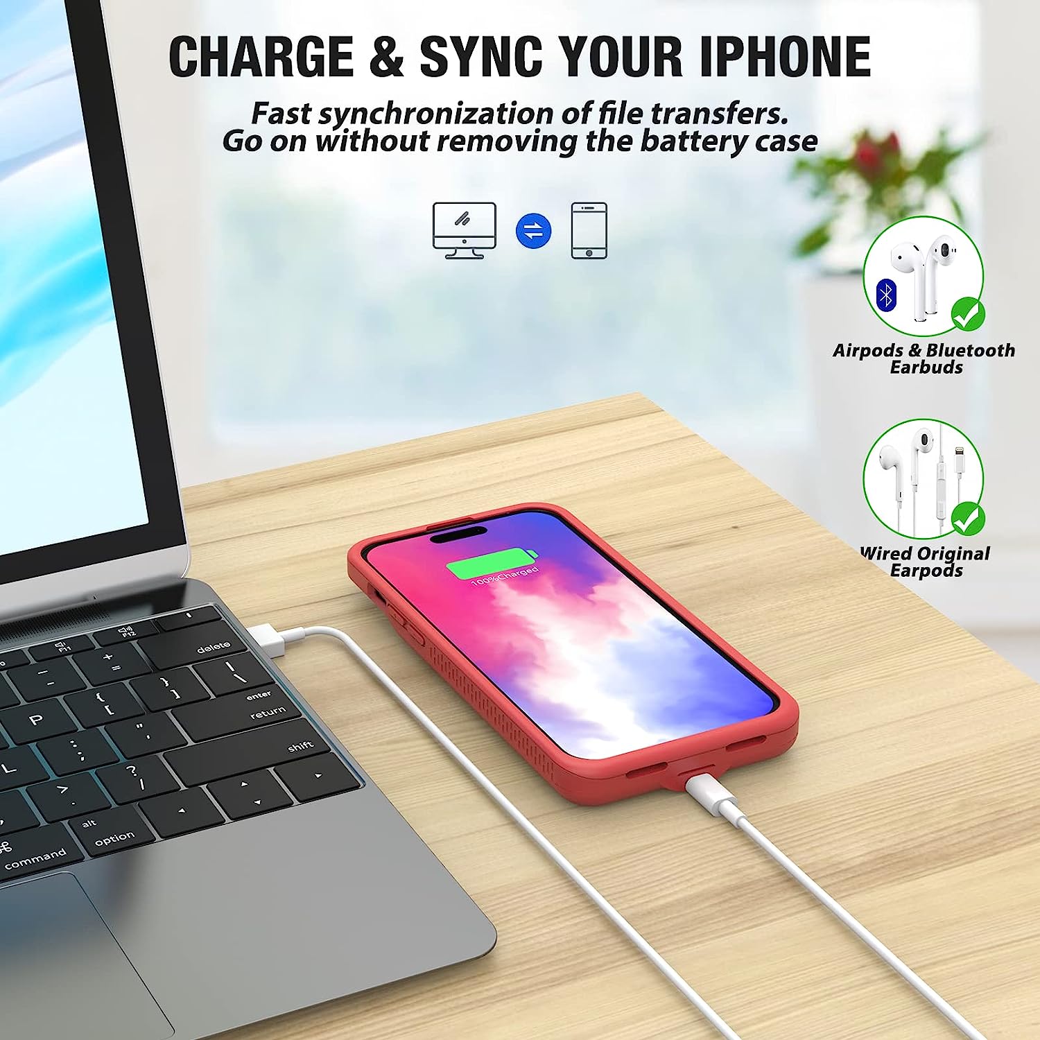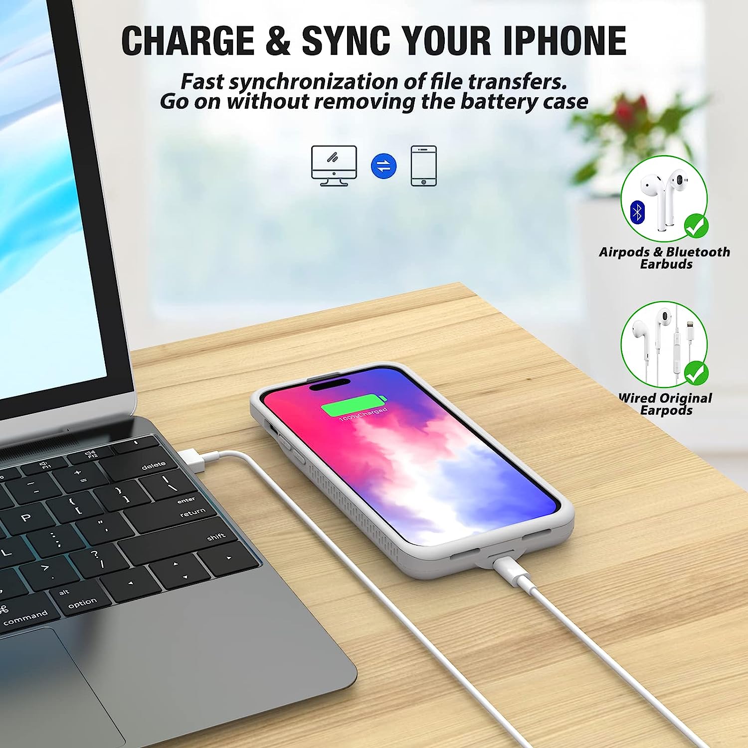 • ⚡【ADVANCED SYNC & FASTER CHARGE】🔋Testing 8000 times in insertion and withdrawal, full Access to the lightning port, with original lightning encryption chip, no pop-up, safer and 5V/1.5A faster charge than other battery case. Amazing sync-through technology, conveniently sync your iPhone to your Macbook, PC or laptop without having to take the battery case off. 4 LED battery level indicators that let you know how much power you have (0--25%--50%--75%--100%).