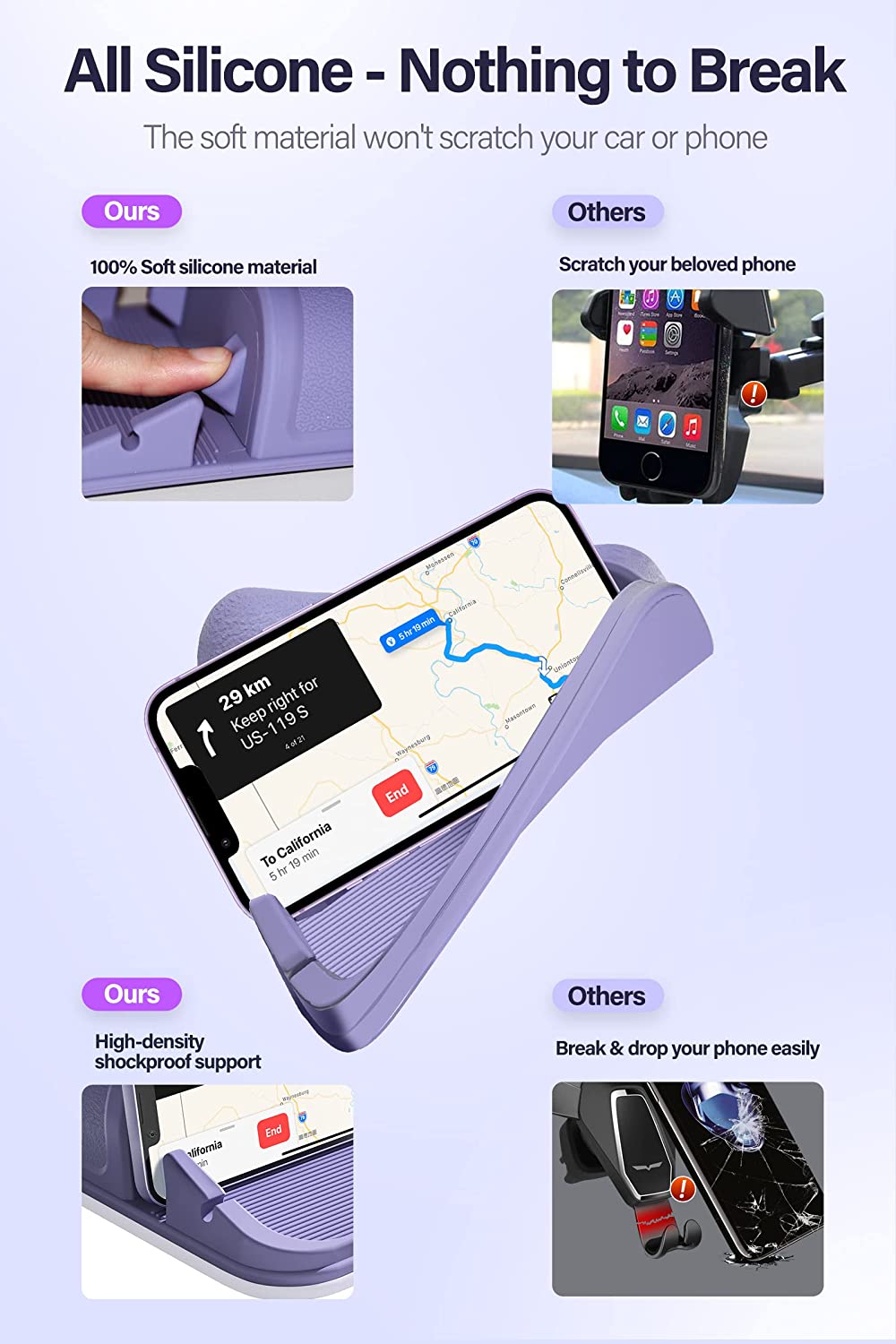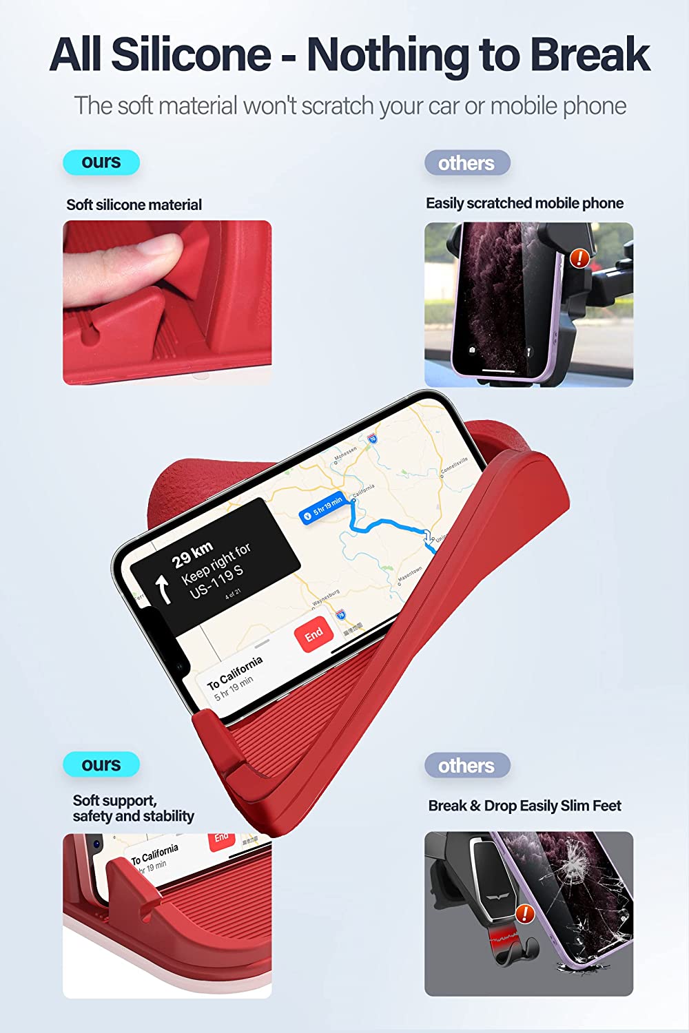 • All Silicone, Nothing to Break: The iphone car mount is all soft silicone so you don't need to worry if it damages your devices. If you've had enough of air vent mount/CD slot mount/windshield suction holder/suction cup holder, you will like its simplicity! No moving parts, springs or anything that can fall apart! This simple but effective phone car holder will be such a great addition to the car!