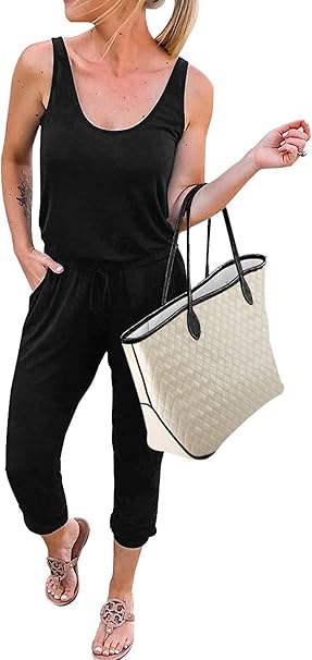 KIRUNDO Women's 2024 Summer Jumpsuits Casual Sleeveless Jumpsuit Drawstring Elastic Waist Romper Pajama with Pockets