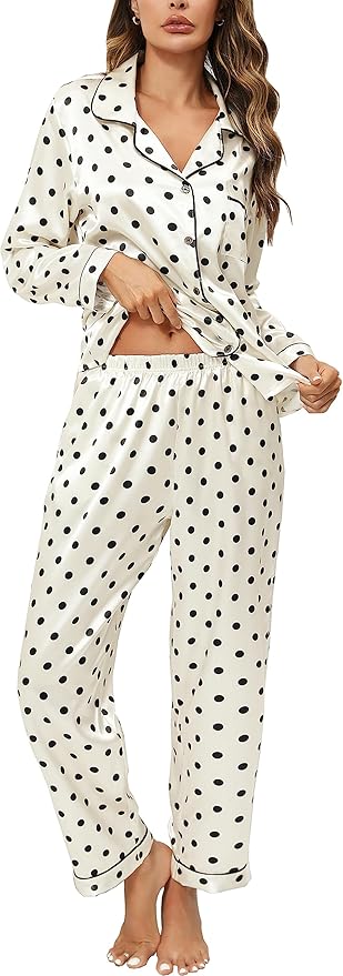 Anjue Silk Satin Pajamas Set Women's Long Sleeve Sleepwear Soft Pjs Set Two Piece Button Down Pj Set with Pockets S-XXL