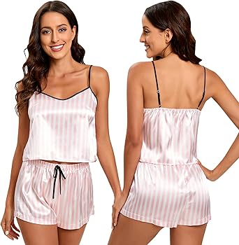 Womens Pajama Set Silk Satin PJ Set V Neck Pink Striped Cami Top Shorts Sleeveless Sleepwear Spaghetti Straps