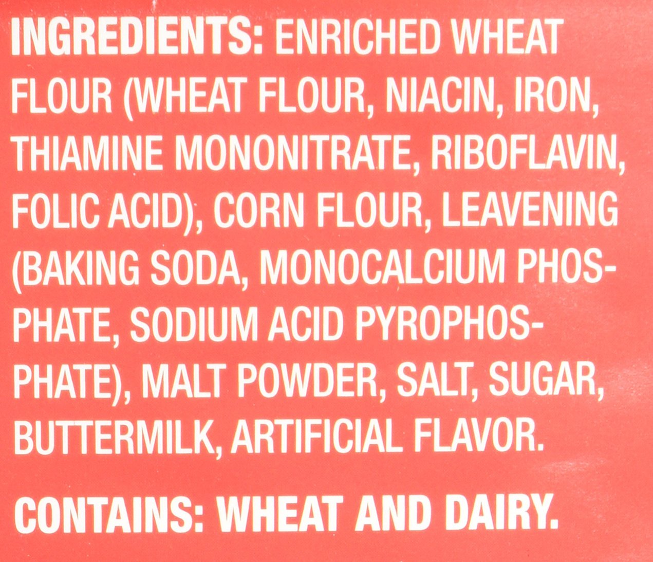 • Mixture includes wheat and corn flours, leavening, malt, sugar, and buttermilk powder