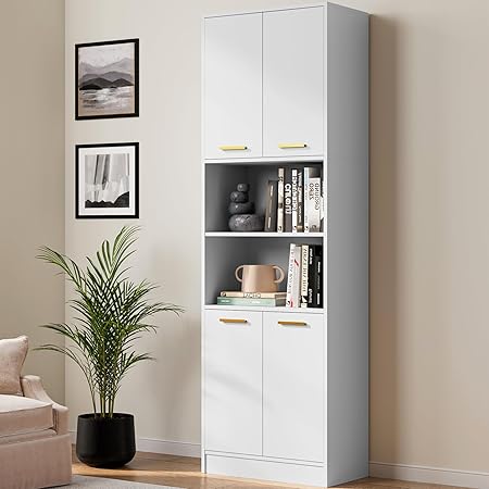 Cozy Castle Kitchen Pantry Storage Cabinet 75" Tall 4 Doors Wood Freestanding Cupboard with Open Countertop and Adjustable Shelves Utility Cabinets for Dining Room Living Room Laundry Bathroom, White