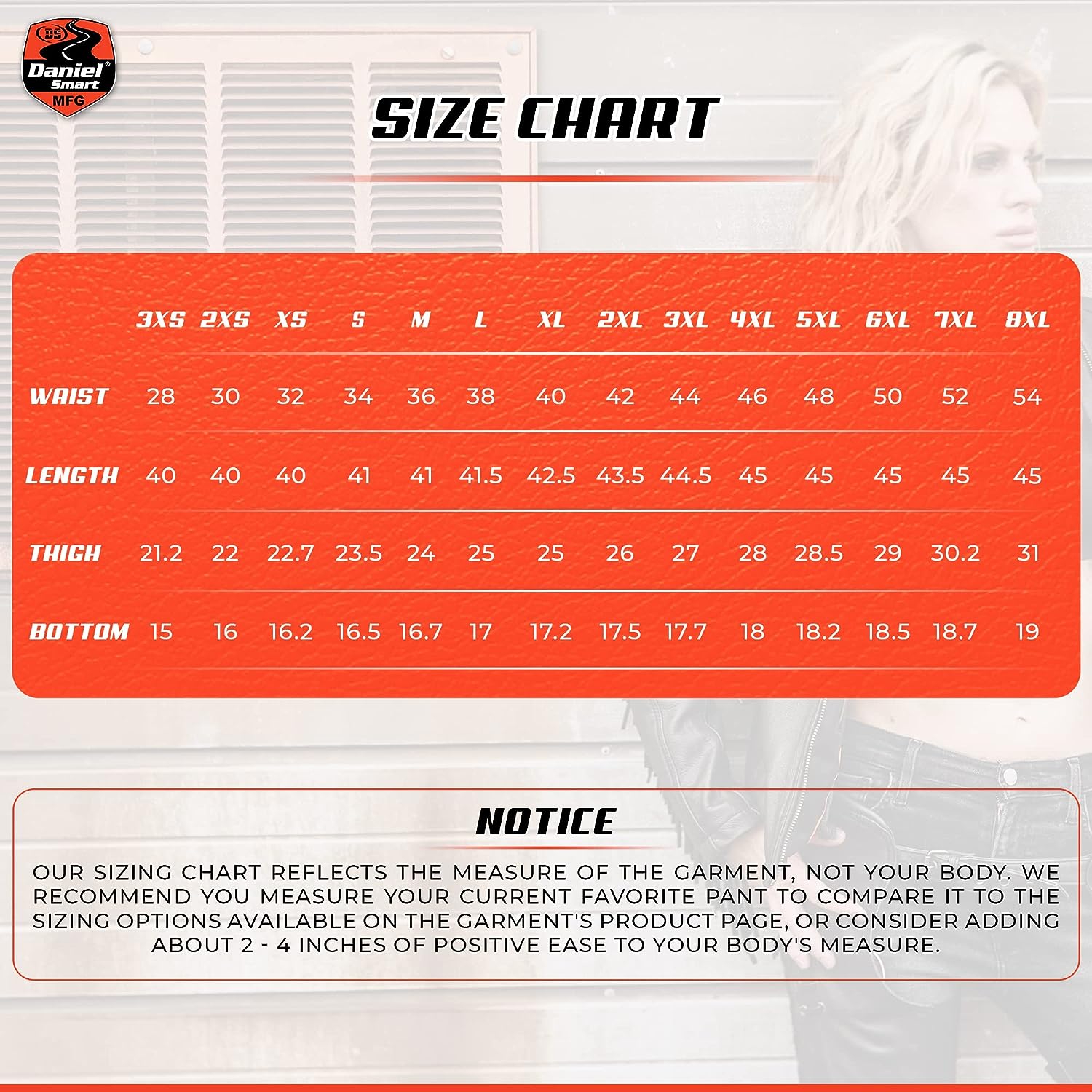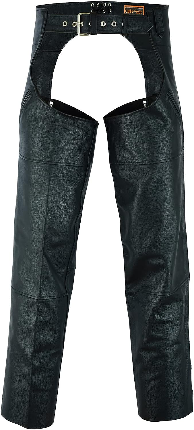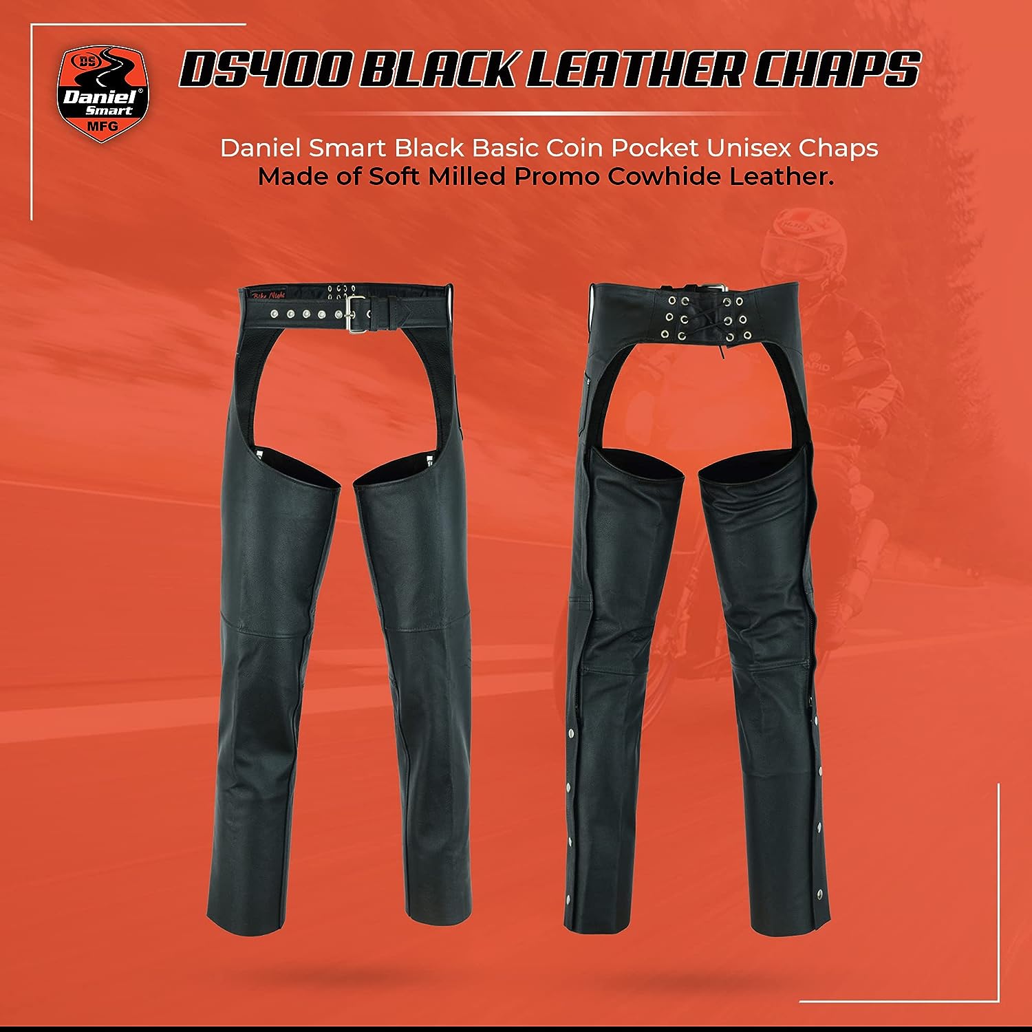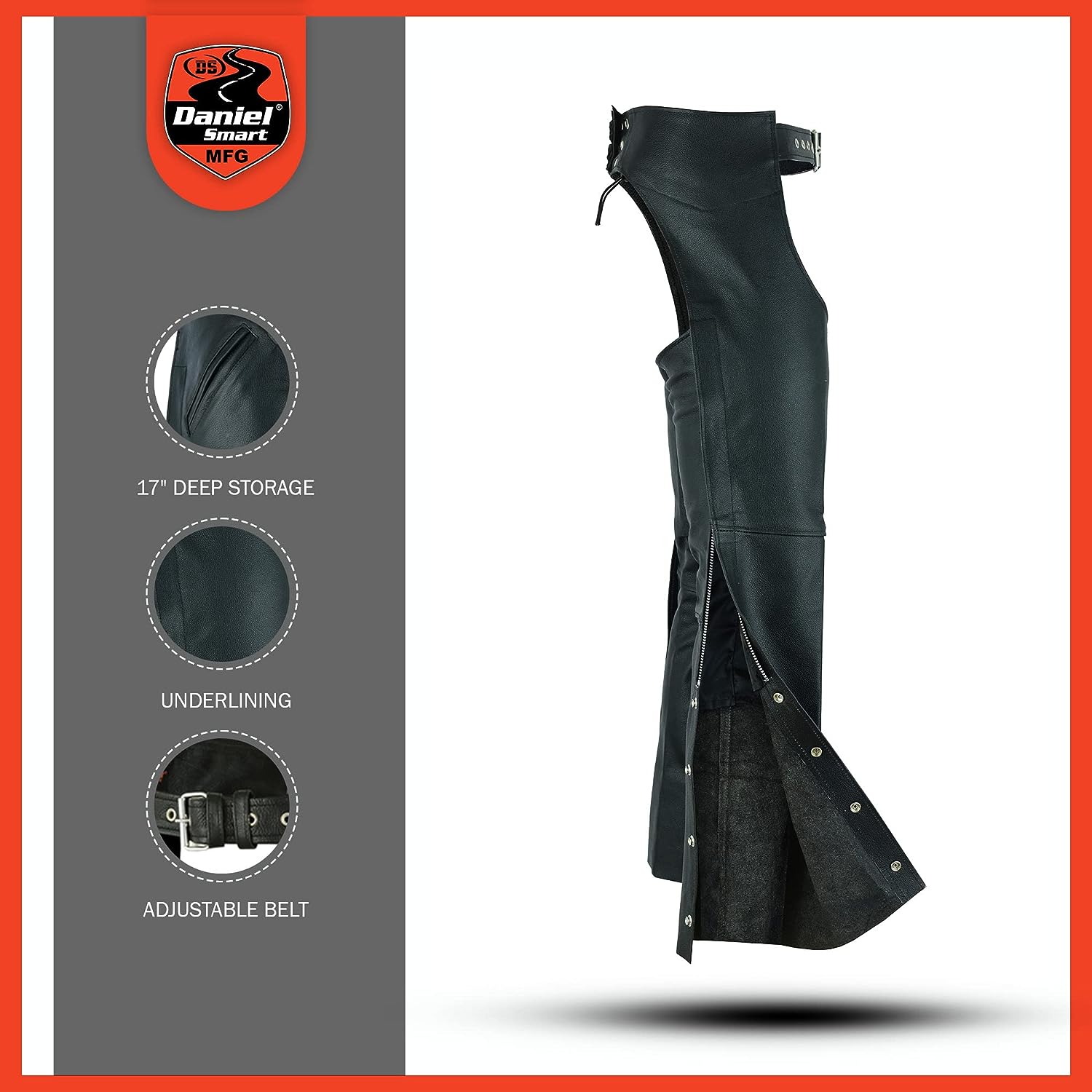 Daniel Smart Motorcycle Leather Chaps All Season Unisex Biker Pant with Customizable fit and Jean Style Pockets