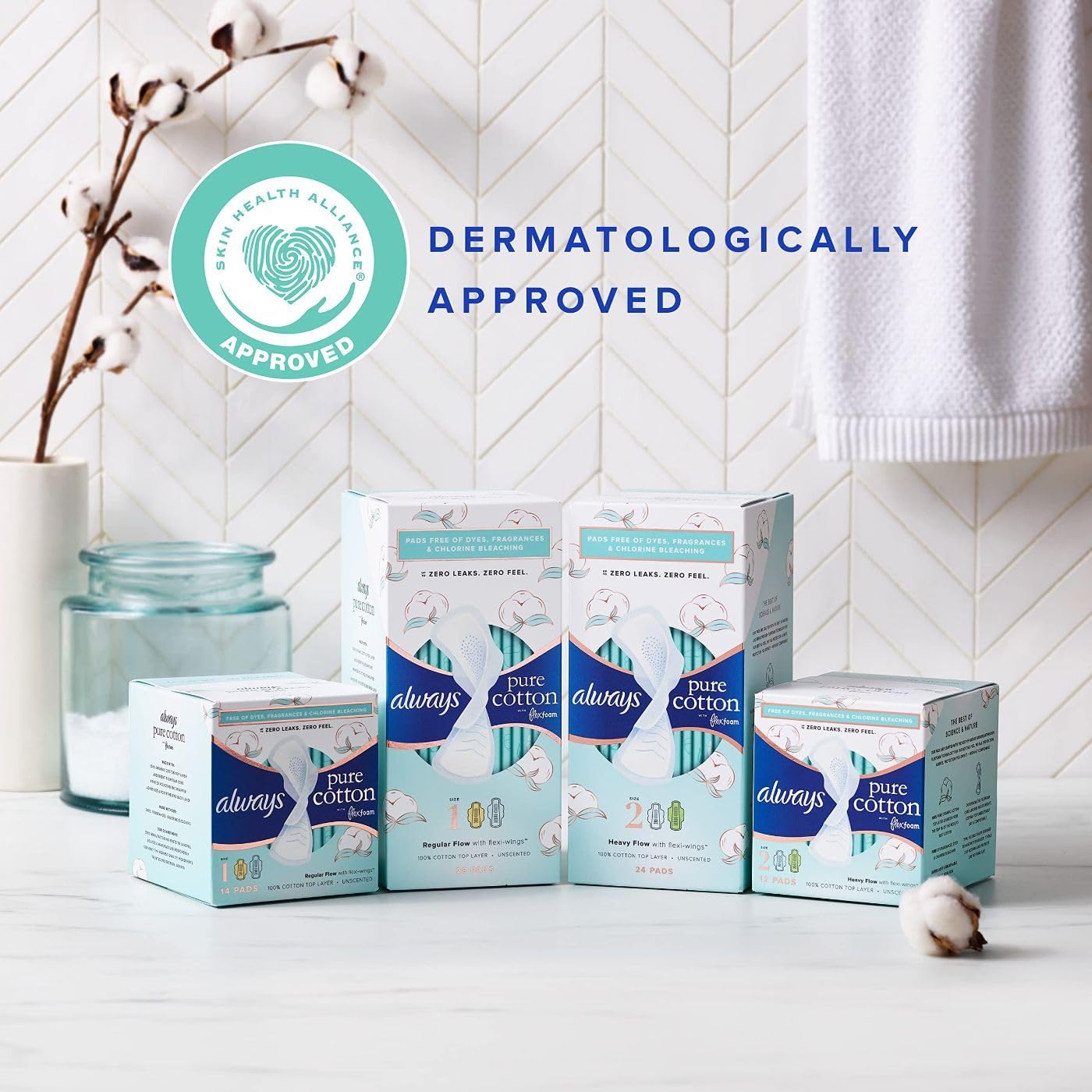 Always Pure Cotton, Feminine Pads For Women, Size 2 Heavy Flow Absorbency, Multipack, With Flexfoam, With Wings, Unscented, 24 Count x 3 Packs (72 Count total)