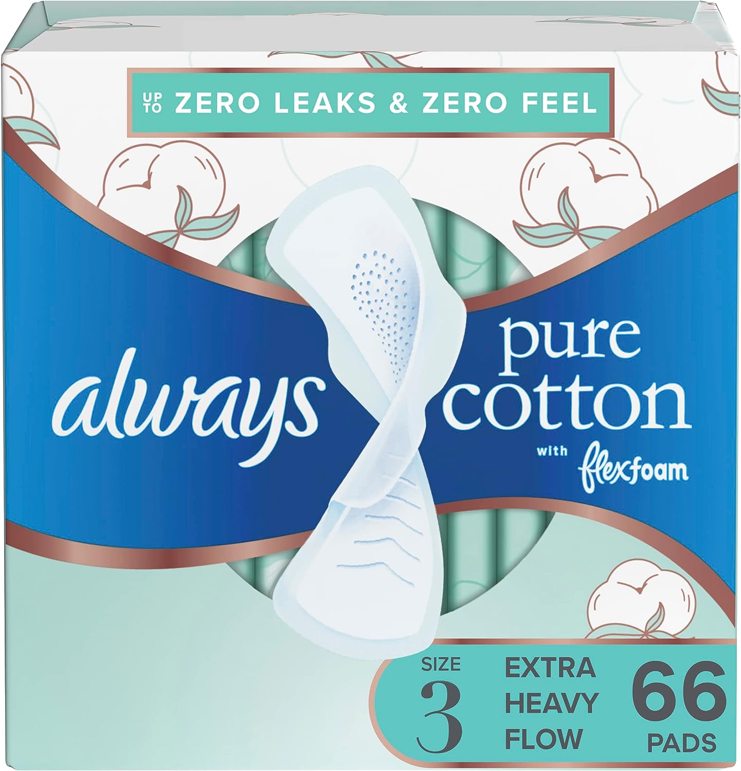 Try Always Pure Cotton Pads made with FlexFoam for up to Zero Leaks, Zero Feel protection. Discover the best of science and nature. Always Pure Cotton with FlexFoam pads combine a 100% pure cotton top layer with the breakthrough FlexFoam core, for incredible period protection that gives you peace of mind. Always Pure Cotton with FlexFoam pads are free of dyes, fragrances and chlorine bleaching. The pure cotton top layer is sourced from premium cotton that makes up less than 1% of the world's supply, meeting strict ingredient and processing requirements. You can feel 10X drier than the leading pad brand with a cotton top layer, so no feel and no fail protection is possible with Always Pure Cotton with FlexFoam pads!Are you getting the right protection from your pad? Using the wrong pad size can lead to leaks. Step up in size to help stop leaks. Now you can find your fit with Always MY FIT, a tailored sizing system to help you find the best protection based on both your flow AND panty size. Use the sizing chart in the images to find your fit for day and night.Always Feminine Products are now HSA-/FSA-Eligible in the US.