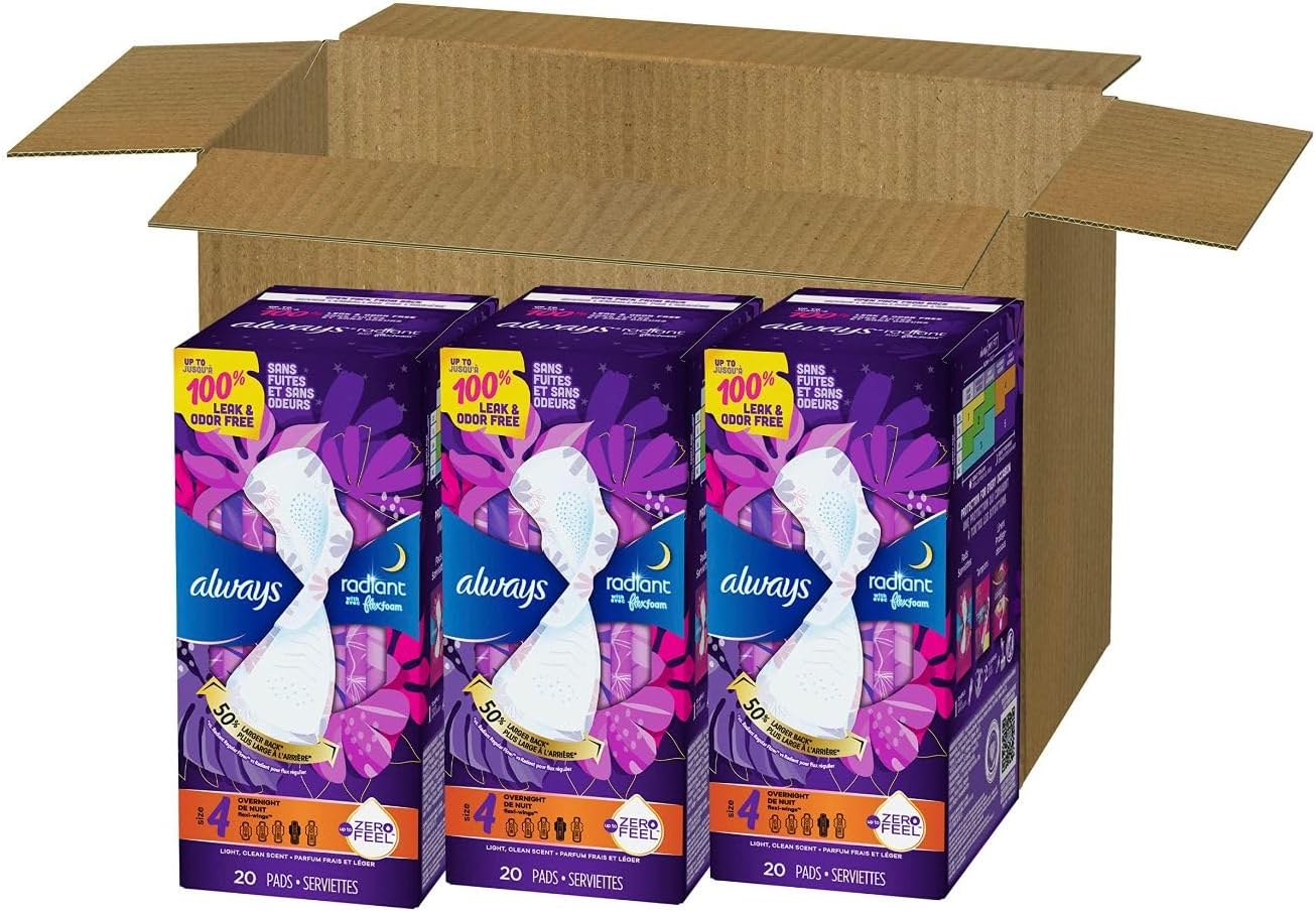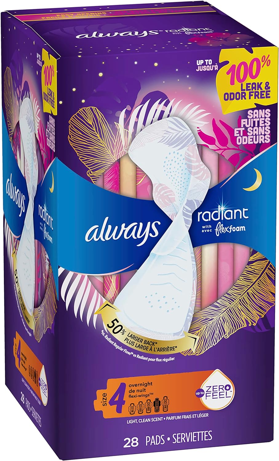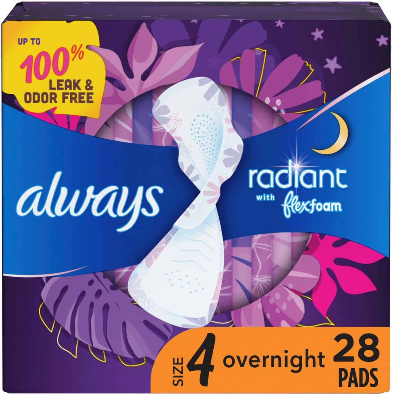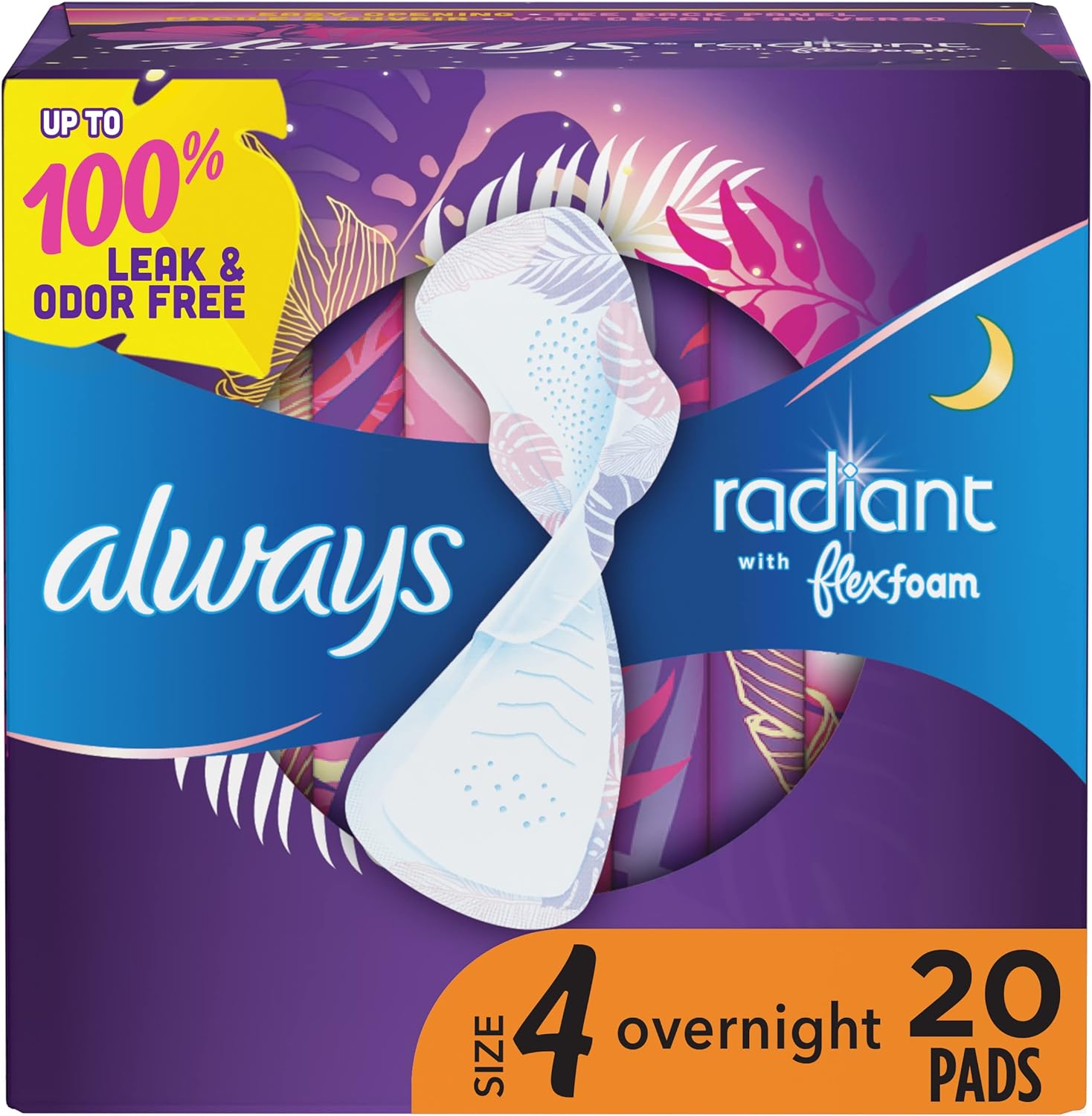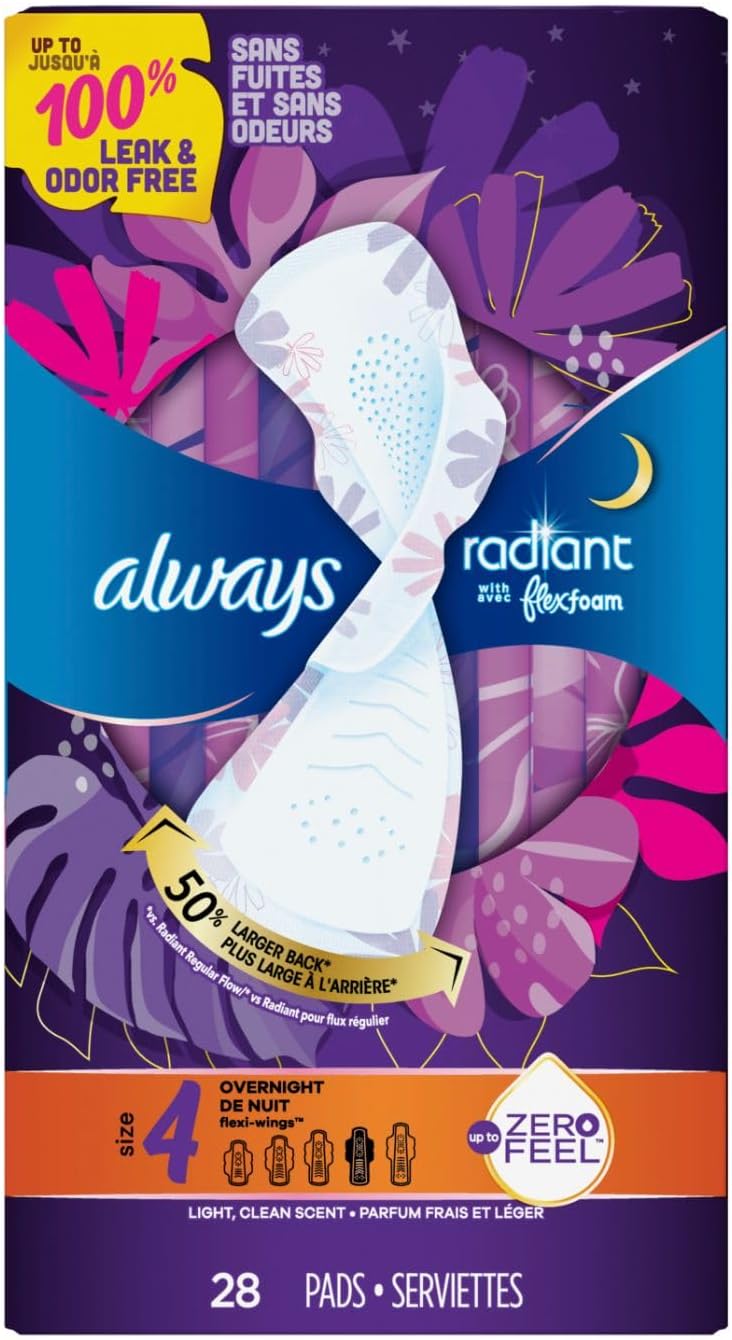 Try Radiant FlexFoam for a pad that gives you style, protection, AND comfort! With Always Radiant FlexFoam Overnight period pads, a 100% leak and odor free protection is possible so you can wear what you want and do what you want any day of the month! FlexFoam has a 50% wider back for up to 12hrs of worry-free protection. Even on heavy days, FlexFoam pads absorb 10x their weight. Always Radiant is made with FlexFoam for a thin and flexible pad that doesn't skip out on protection. Feel radiant with the “neon vibes” package and wrapper designs, because pads don’t have to be boring. Always FlexFoam pads are dermatologically tested, and approved as skin friendly by the Skin Health Alliance. Always products are FSA/HSA Eligible.