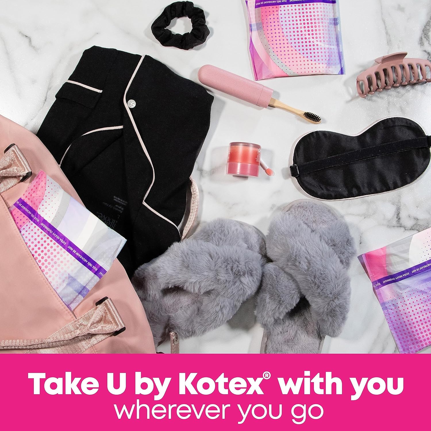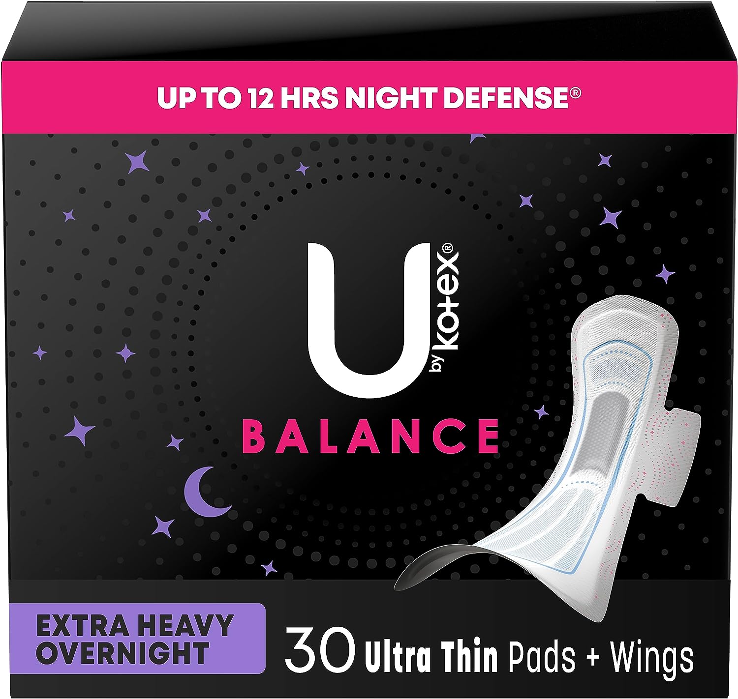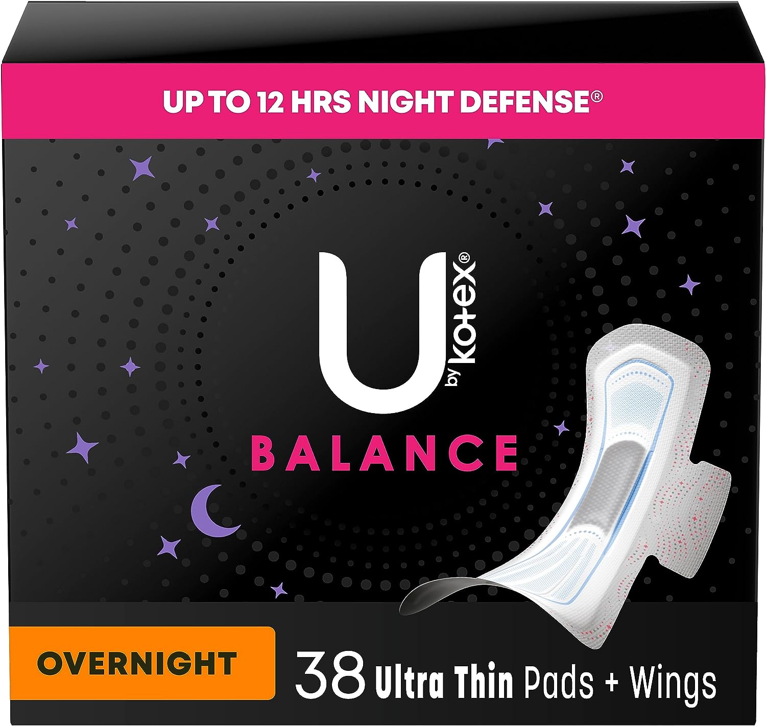Get yourself a pad that's designed for all-night protection with the U by Kotex Balance Ultra Thin Overnight Pads with Wings. Each period pad comes with U by Kotex's CushionCore that absorbs instantly for up to 100% leak-free protection for up to 12 hours. The CushionCore is also infused with 100% plant-based charcoal to help stop odor. Not only that, but these sanitary pads are dermatologist-tested, contain no harsh ingredients and are made without pesticides, fragrances, lotions, natural rubber latex and elemental chlorine. Made with a 60% larger front and an 80% larger back*, the wings secure the pad in place, while the menstrual pad itself is uniquely shaped to fit and flex with your body to deliver outstanding skin comfort in any position. Each U by Kotex pad is individually wrapped in vibrant colors and patterns, so you can take it with you wherever you go. For period protection during the day, try U by Kotex Balance Ultra Thin Pads. U by Kotex women’s pads are FSA/HSA/HRA-eligible in the US. Packaging may vary from images shown. (*vs. U by Kotex Balance Ultra Thin Regular Pad).