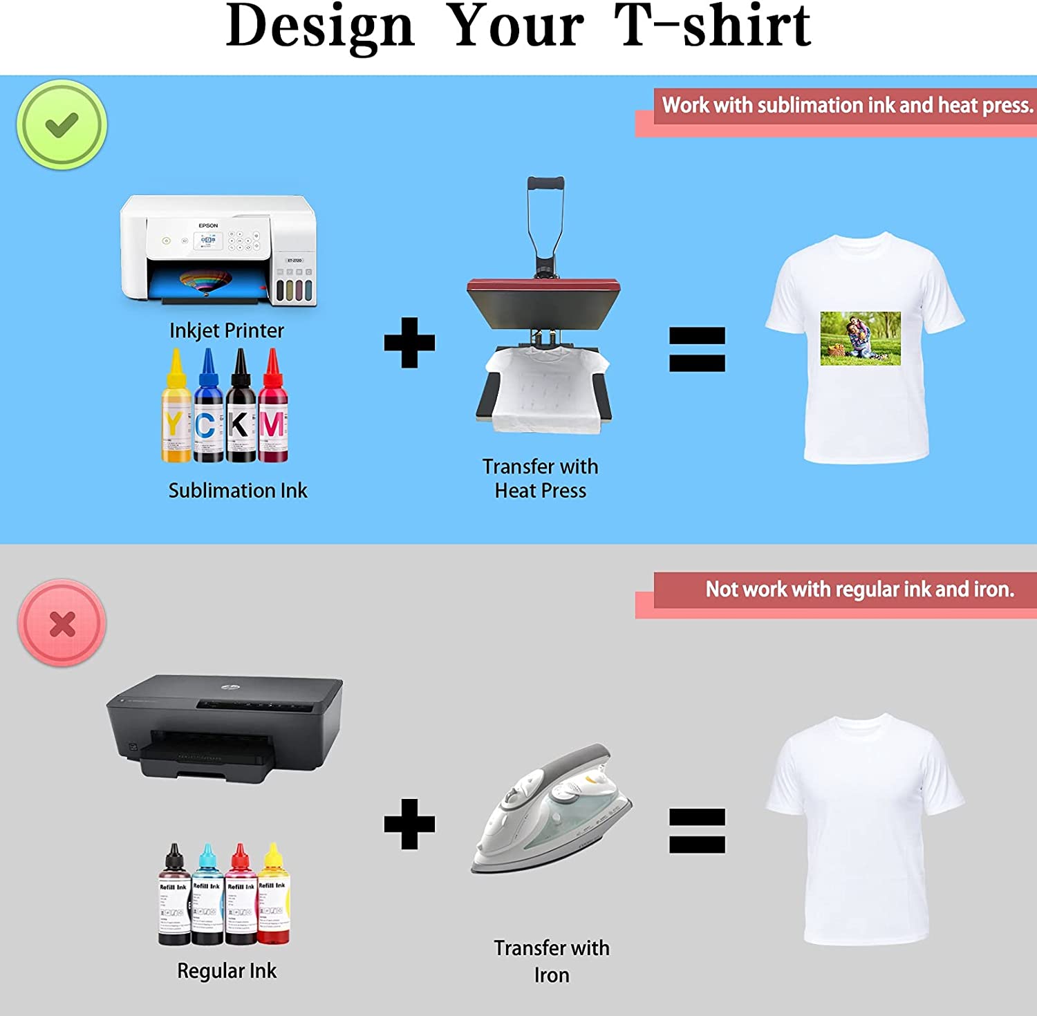 • Warm Tips: This sublimation paper for t shirts compatible with all inkjet printer and only sublimation ink works; Work with light colored polyester fabric and polyester coated items and material with cotton content≤30%; Must store in a cool, dry area, avoid direct sunlight, heat and humidity and the remaining must be put back into the box.