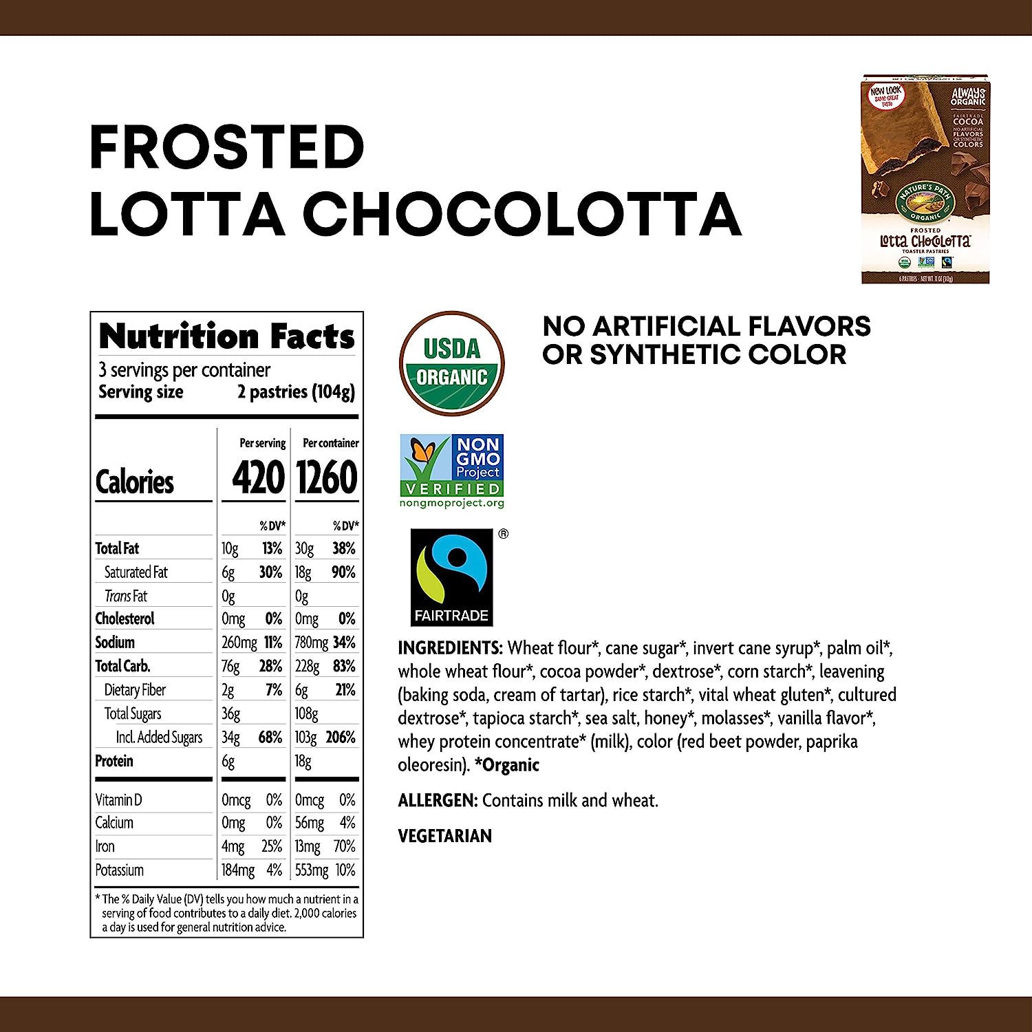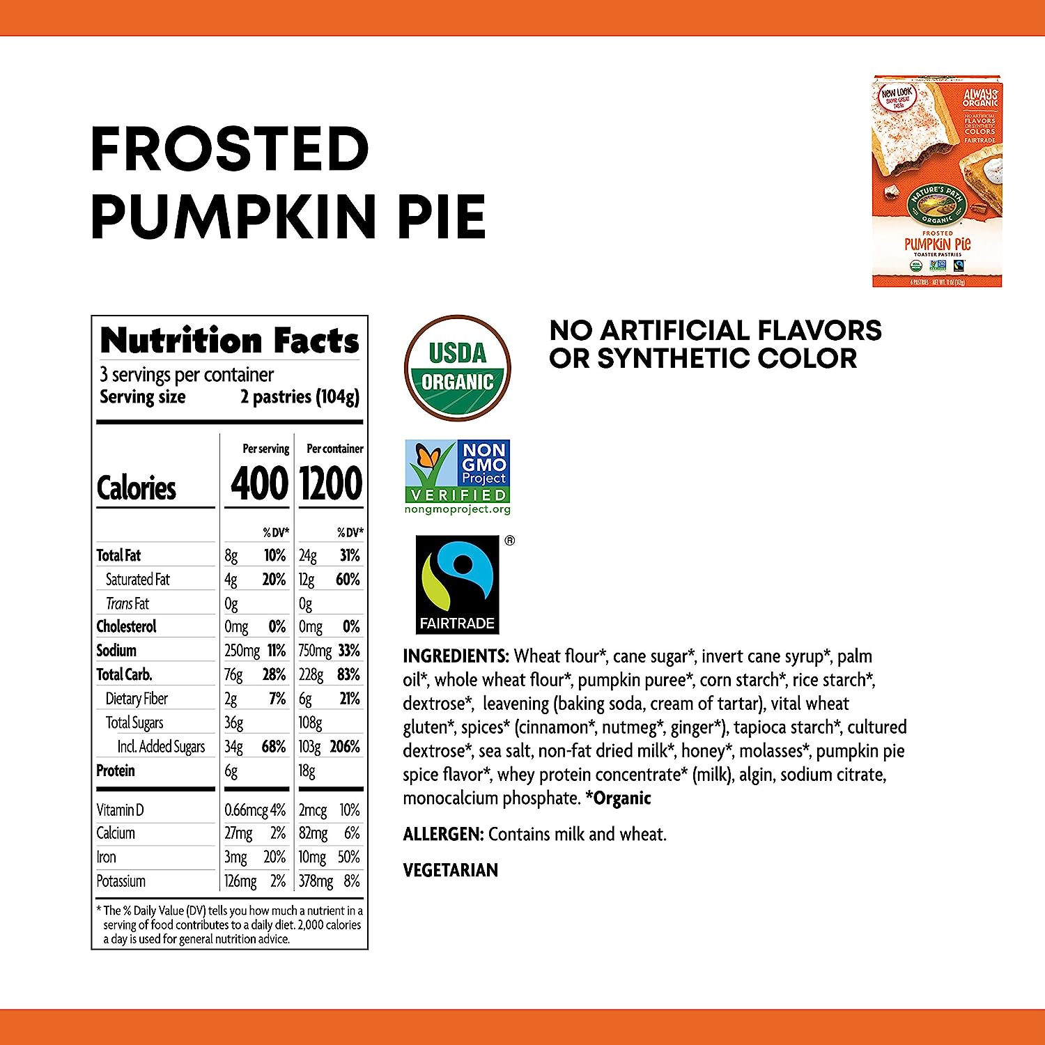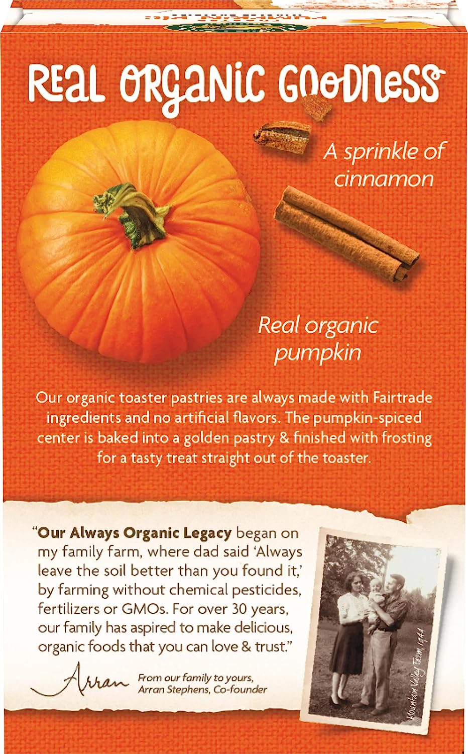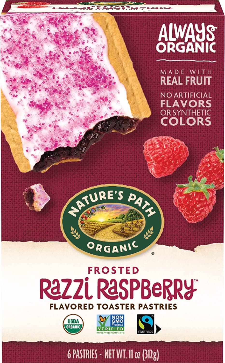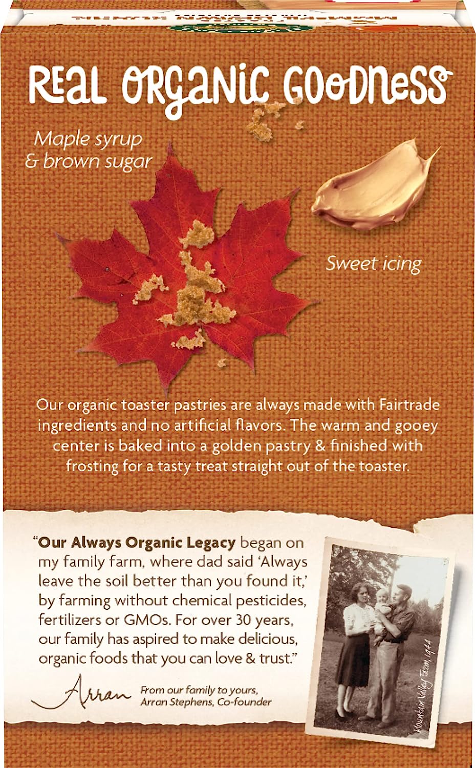 What a treat. Nature's Path Frosted Mmmaple Brown Sugar Toaster Pastries are made of delicious maple and brown sugar, encased in a buttery organic pastry, and lightly frosted on the outside. Perfect for when you need a midday pick-me-up without all of the artificial flavors, synthetic colors, preservatives, or high fructose corn syrup that goes into the usual toaster pastries. As an on-the-go snacking option or a filling breakfast, these toaster pastries are delicious both warm or straight out of the package. Being mindful about your food and choosing to eat organic means you're making the best choice for your health, and our planet. At Nature's Path we hold organic to an even higher standard: to build and regenerate the soil. As pioneers of the organic movement, we believe organic food and farming is the best way to care for our bodies and for the planet. We always have and always will use our voice to stand for what we believe is right, and what organic truly means.